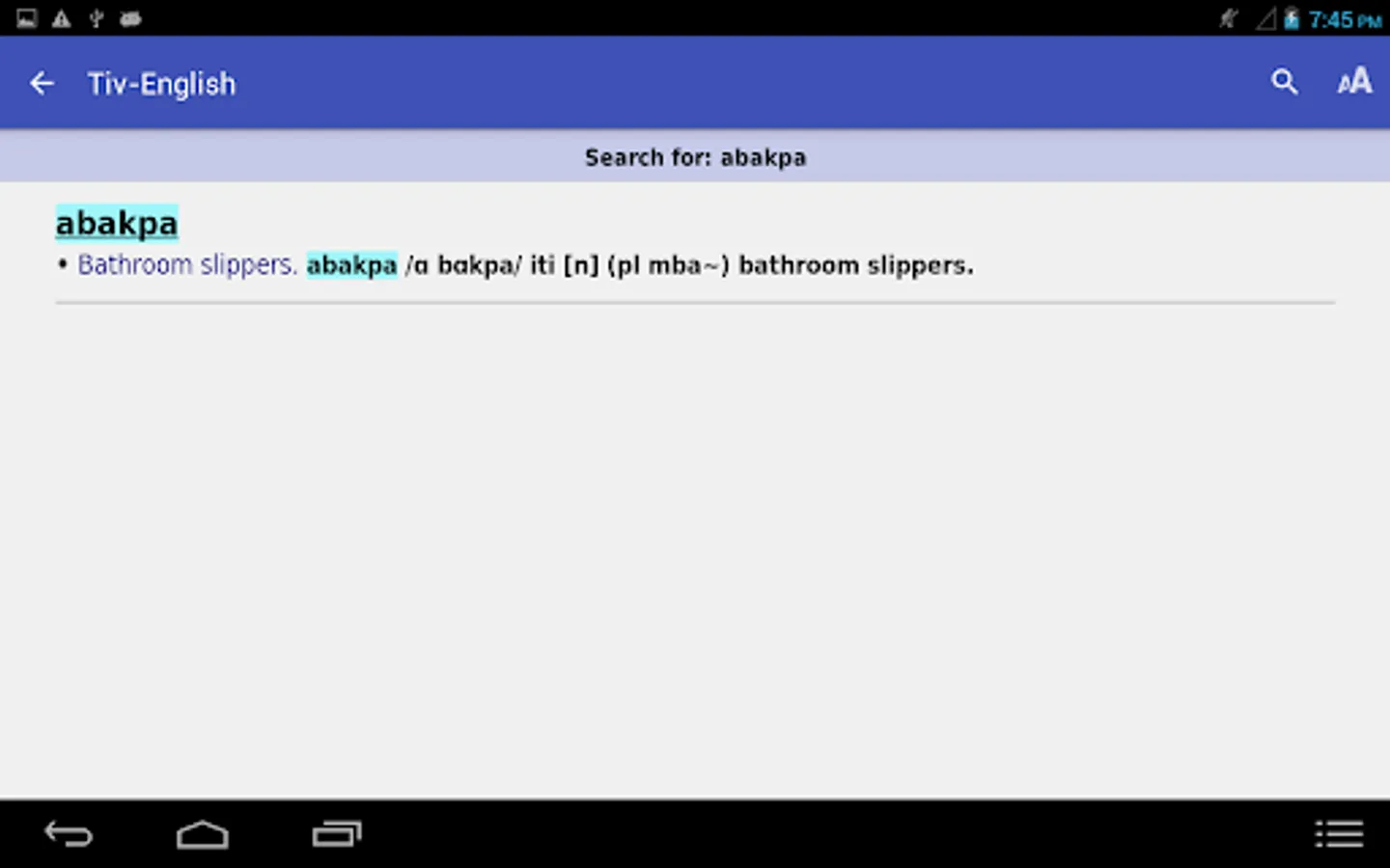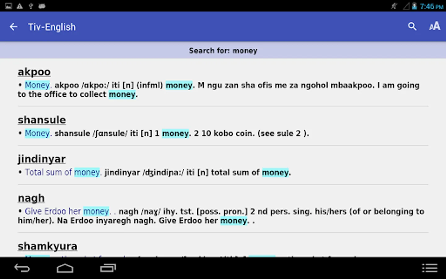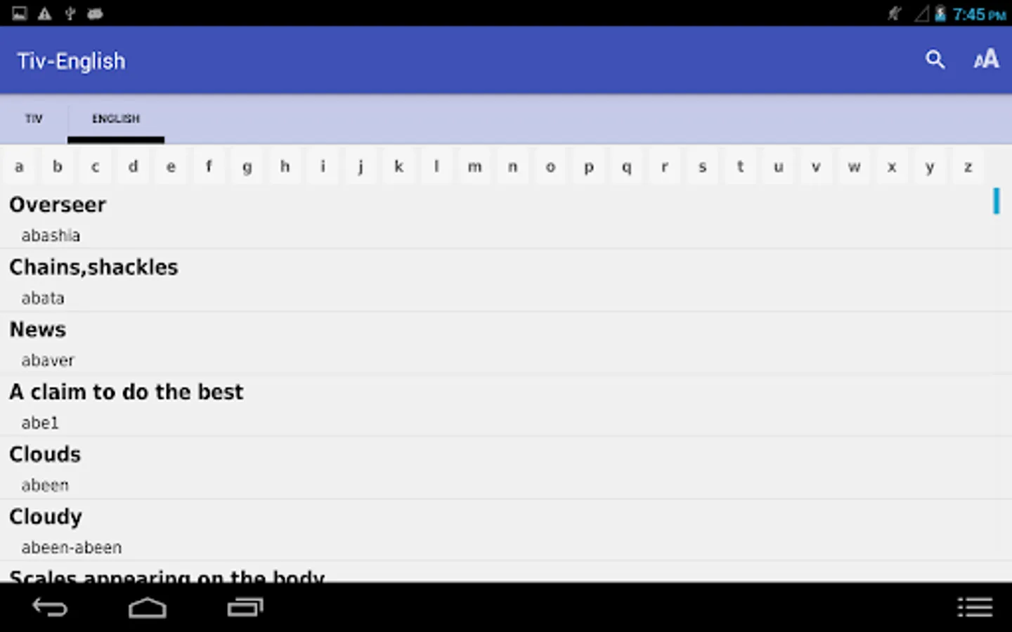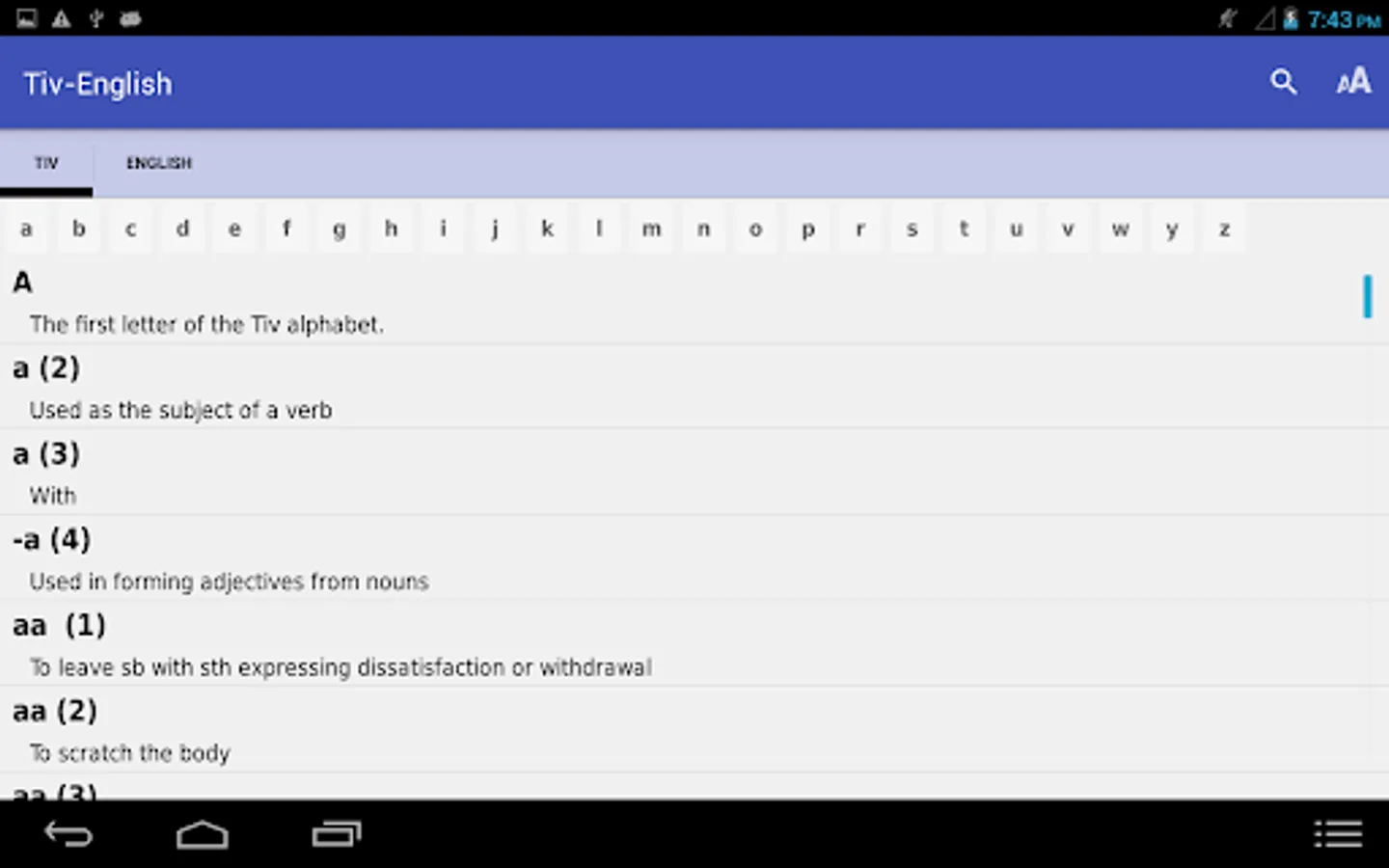 The Tiv-English Dictionary app allows you to optimize your searching for unknown data in Tiv language. Clicking on any Tiv term from the app brings you result from the extensive database. The dictionary is designed to also translate English to Tiv by just taping on the english tab.