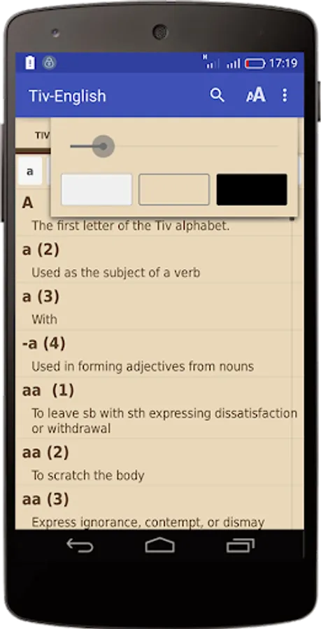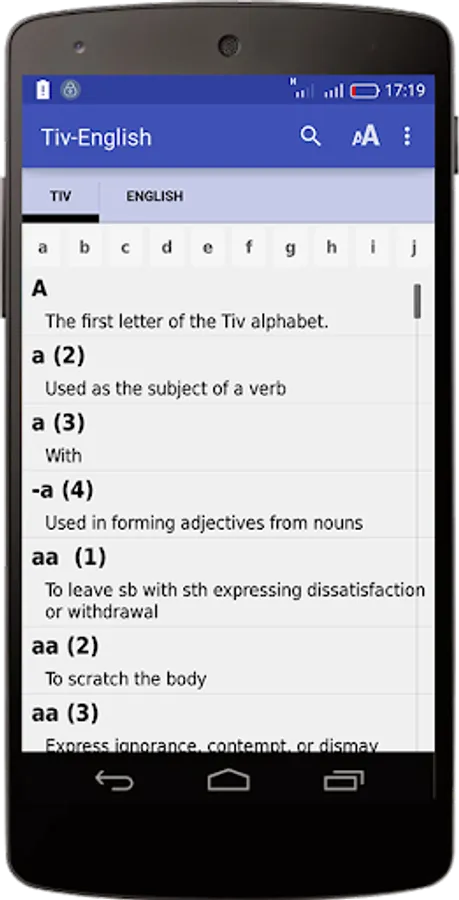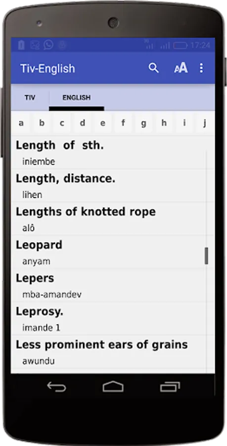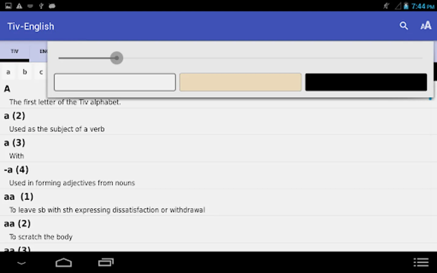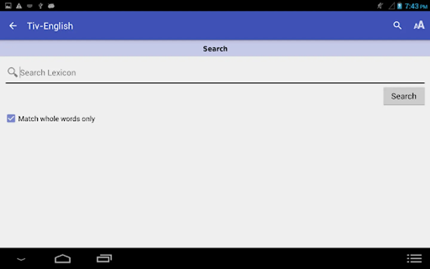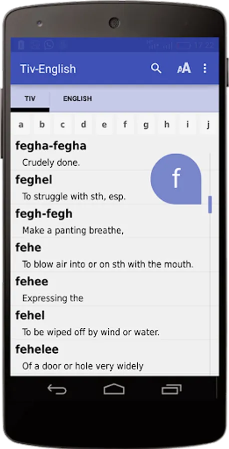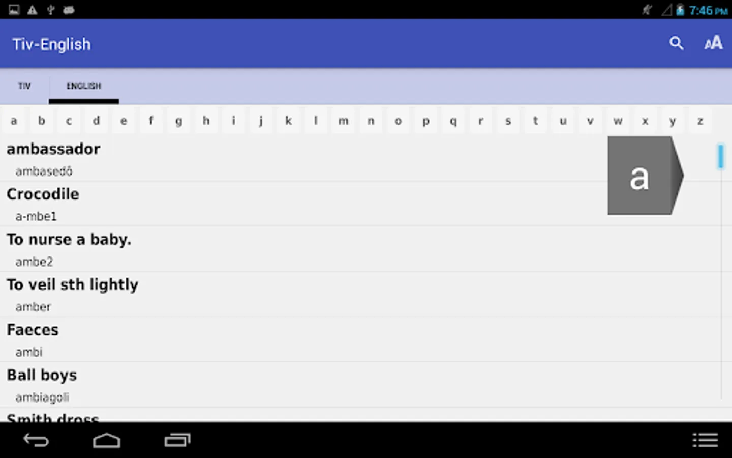 The Tiv-English Dictionary app allows you to optimize your searching for unknown data in Tiv language. Clicking on any Tiv term from the app brings you result from the extensive database. The dictionary is designed to also translate English to Tiv by just taping on the english tab.