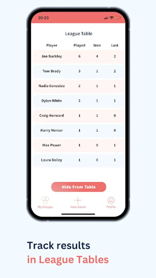 League Table - All players feature in a single League Table (unless they choose not to) showing wins, losses, games for and against, win rate and ranking