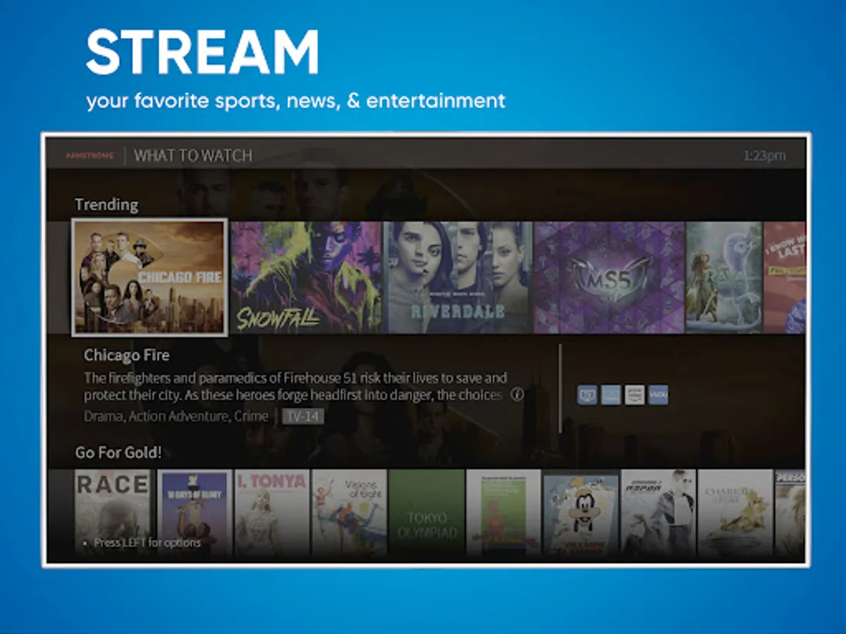 The free ARMSTRONG EXP stream app for Android TV is the ideal entertainment app serving up control, discovery, and a place for viewing live TV, EXP On Demand, and recorded shows.