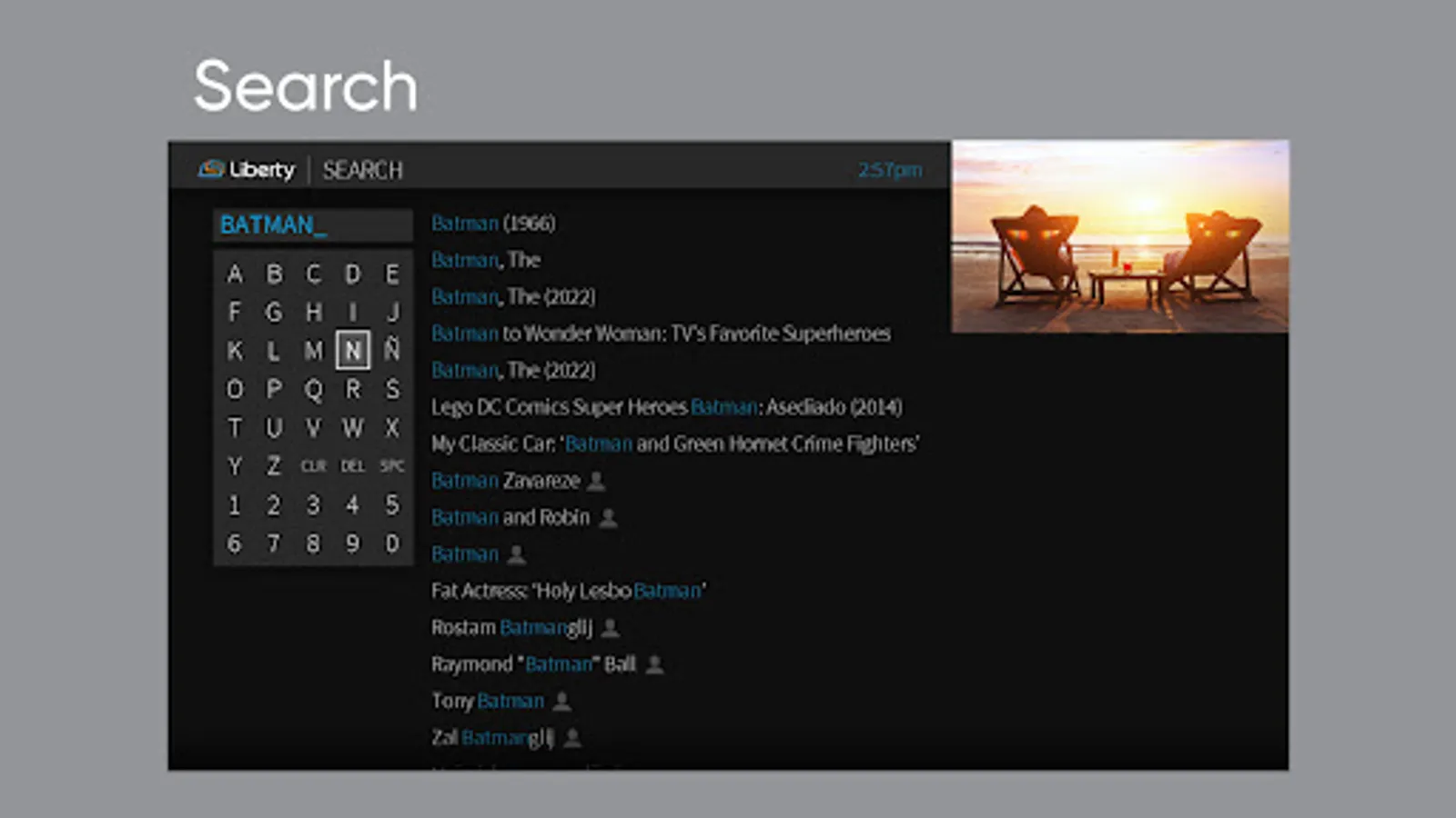 • Liberty On Demand - Choose from thousands of titles, from series, movies, documentaries, and sporting events.