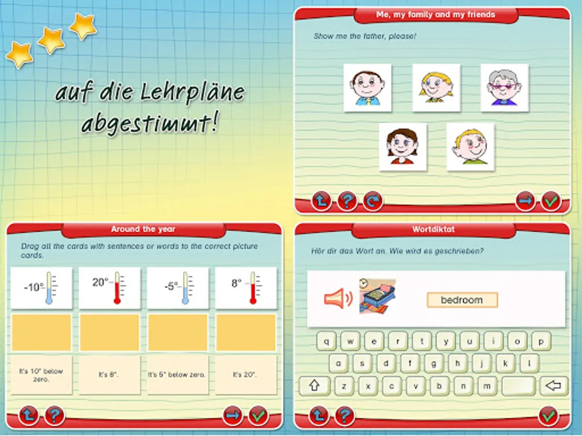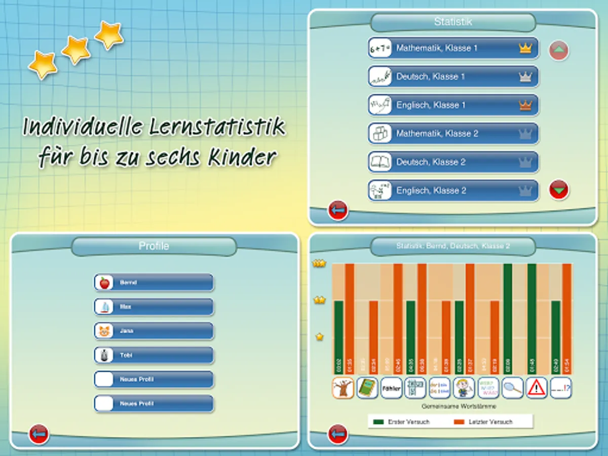 Dissolved duties's are immediately recognized. Collecting stars motivated to continue learning and bonus games encourage additional motivation and concentration. This guarantees long learning fun.