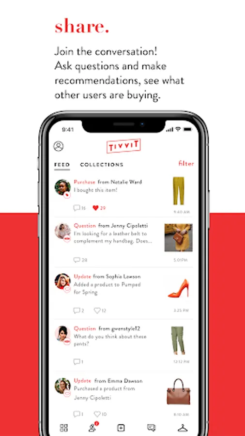 Share recommendations, build your fashion community, shop, and get paid with TIVVIT, the premier peer-to-peer social shopping app. Not sure which shoes would go best with your date night outfit? Post your look on TIVVIT and get recommendations. Support your friends by purchasing through their link, and make money from your recommendations. Connect with your favorite tastemaker to get their opinion on the perfect accessories for your favorite dress, or scroll through their collections to see their favorite current trends.