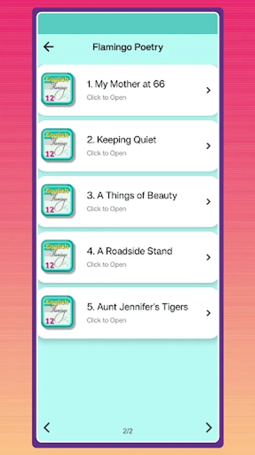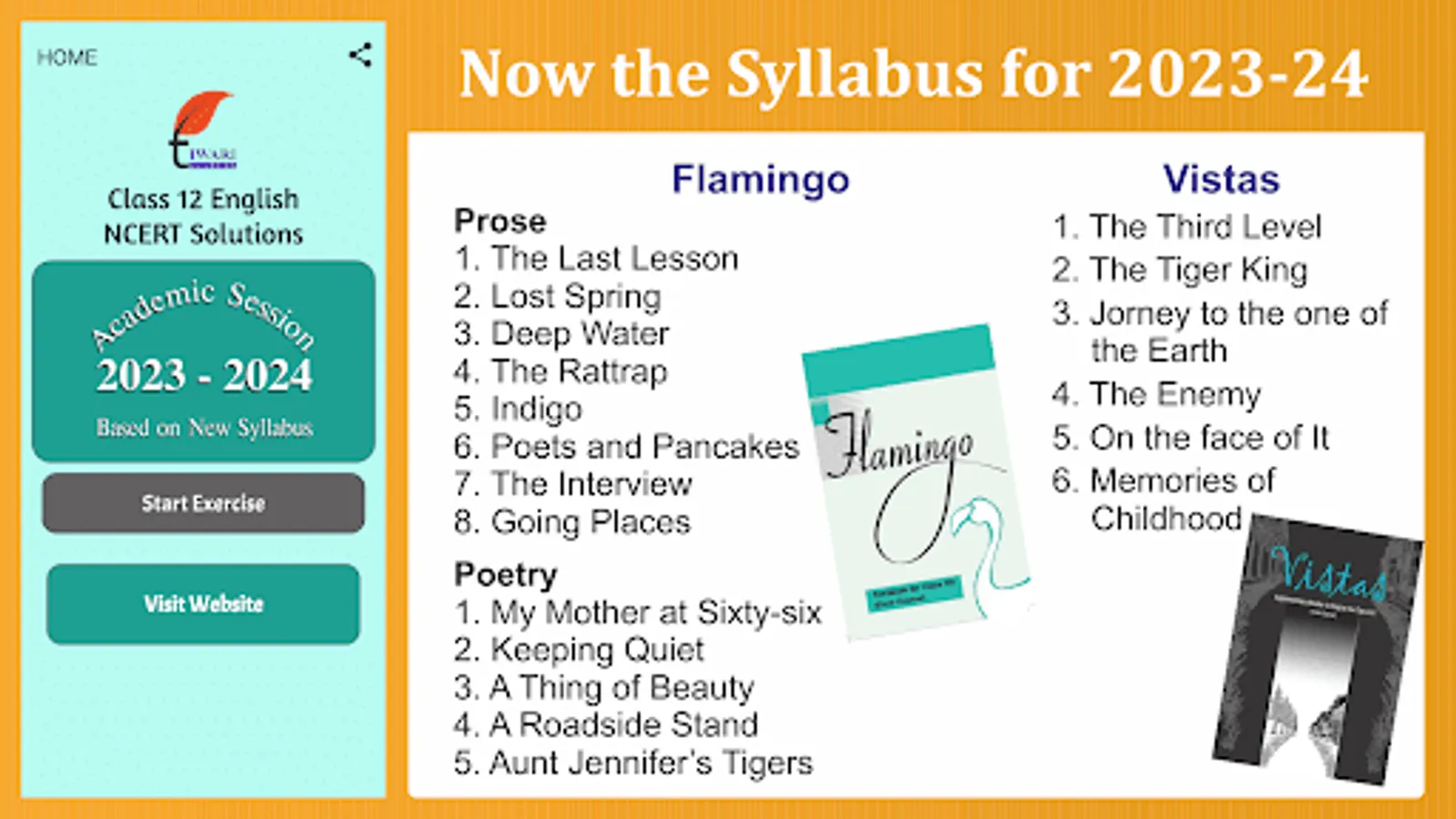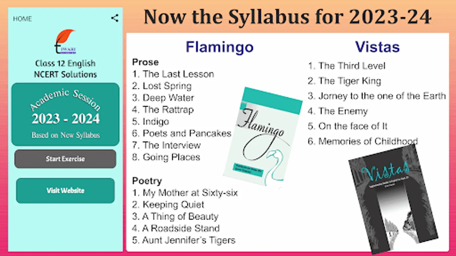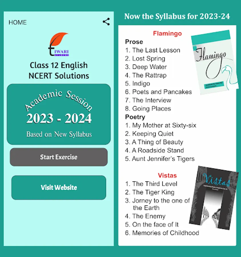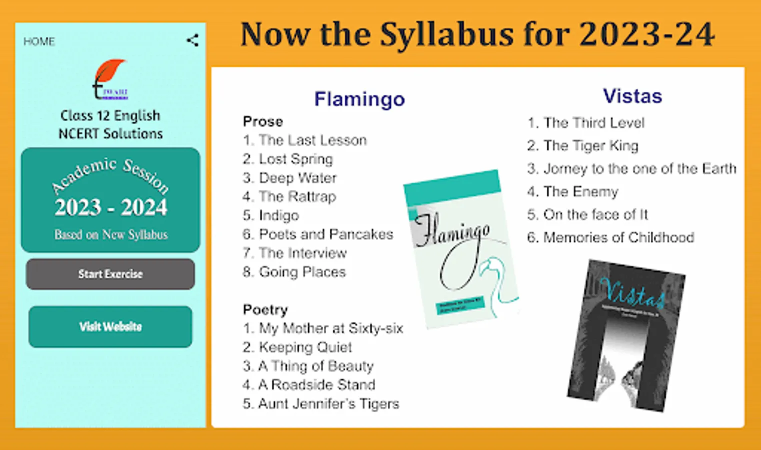 Note: Earlier there were 6 poem and 8 chapters in supplementary readers but as per new NCERT textbooks issued for academic session 2023-24, there are only 5 poem and 6 chapters in Vistas. The number of chapters in Flamingo remain same (8 chapters as usual in previous session). This app contains the solutions of chapters applicable in academic year 2023-24 only.