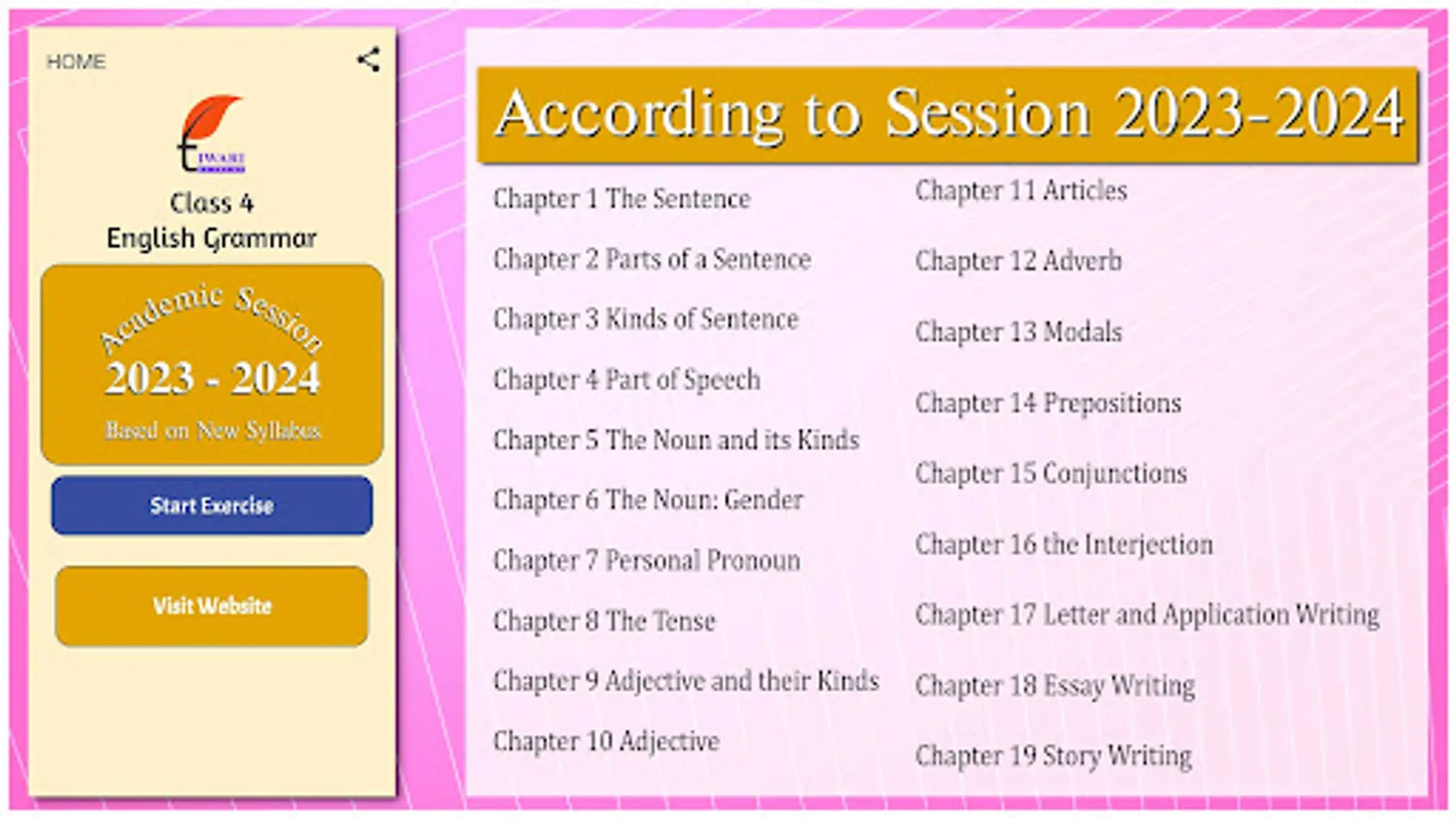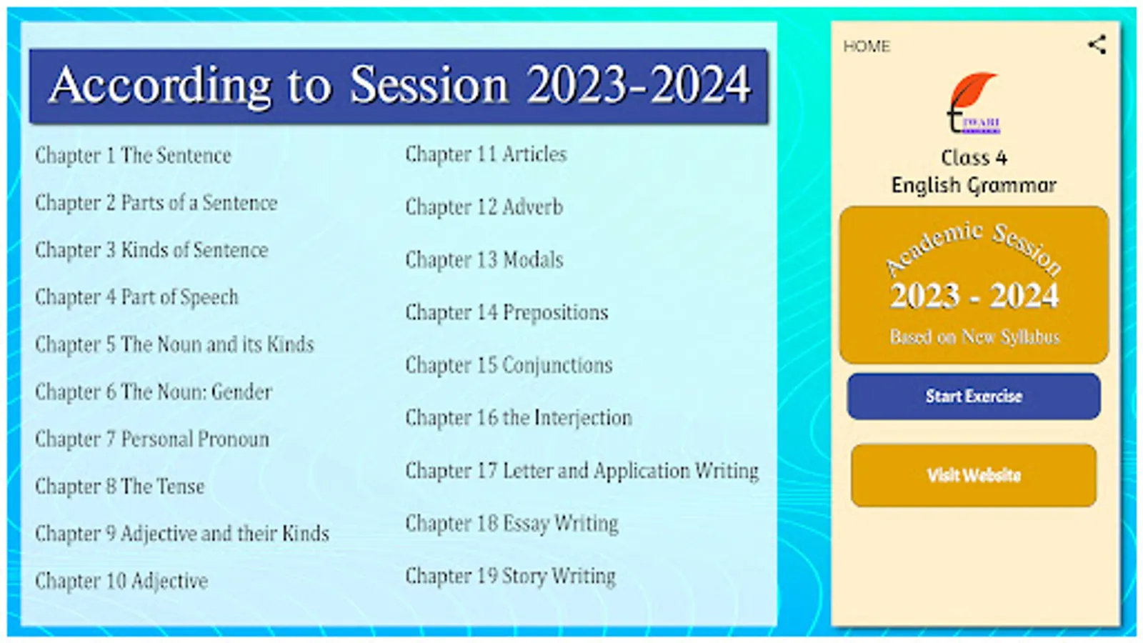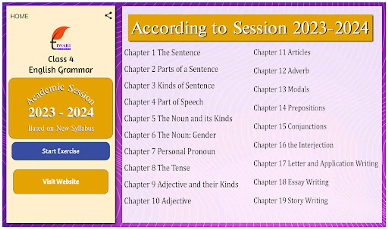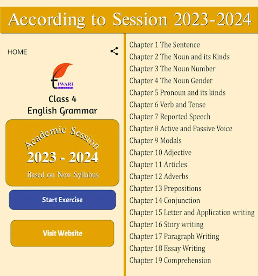 Class 4 English Grammar Book is revised and updated for academic session 2023-24 based on CBSE and State board syllabus. After each chapter, there are practice exercises and puzzles for revision. The class 4 English Grammar app contains the following chapters: