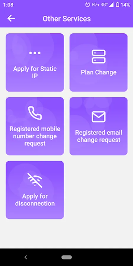 As per customer requirement we have also added some other services like... Apply for static IP, Change his/her existing plan, Request for change of registered mobile number. Request for change of registered email id.