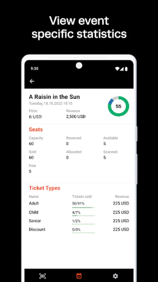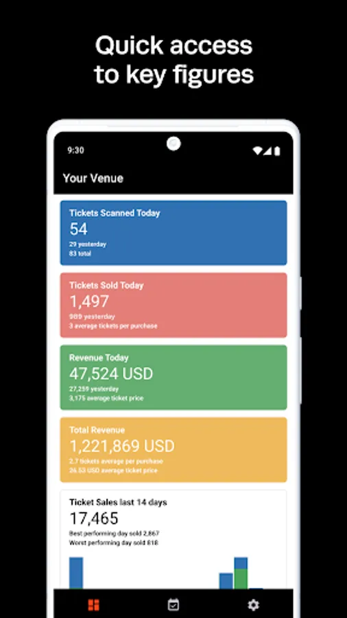 The app gives users a quick view of the most important figures such as tickets sold today and yesterday, total revenue of upcoming events and sold amount of tickets per day the last 14 days. Then start exploring how many tickets are sold and how much revenue is generated by different ticket types.