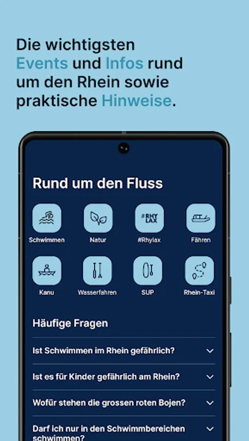 - On the river: This section answers frequently asked questions, presents various water sports and provides information on considerate coexistence (#RHYLAX) and nature conservation.