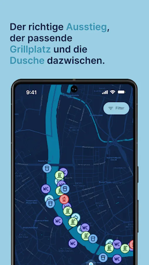- Map: The map is filterable and contains practical information on places around the rivers, such as recommended swimming areas, toilets, food & drink, barbecue areas and more.