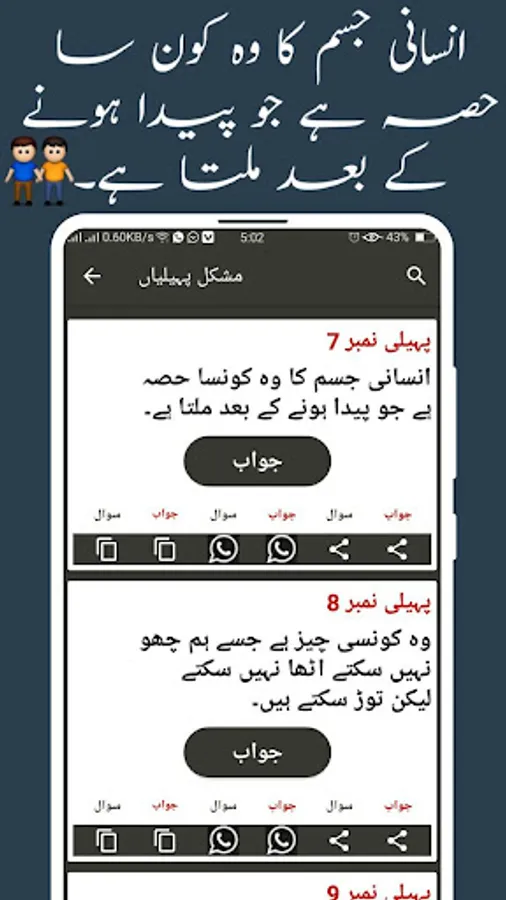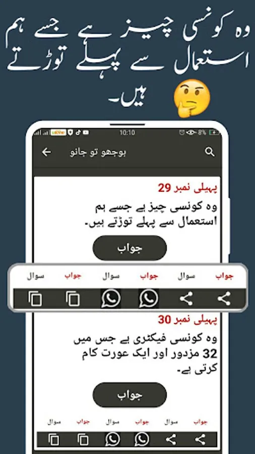 π’ Are you getting bored? Donβt worry this app finishes your boredom. It includes Urdu Paheliyan 2023 as well as Roman Urdu + Hindi Paheiyan for our Indian users. You can Copy, WhatsApp, and Share both Questions and Answers of Paheli (Riddle). It includes a number of Classic and Informative Urdu Paheliyan with Answer Offline that finish your boredom and make you Relax.