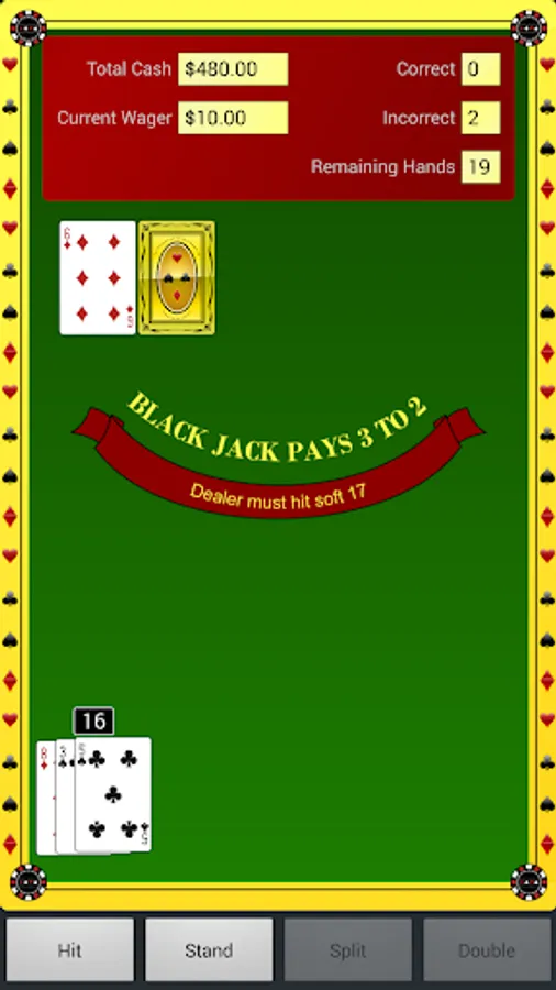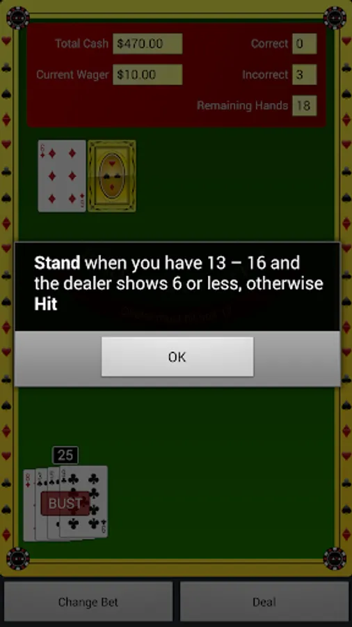 * Basic Blackjack strategy coaching informs the player of the best move when a mistake is made.