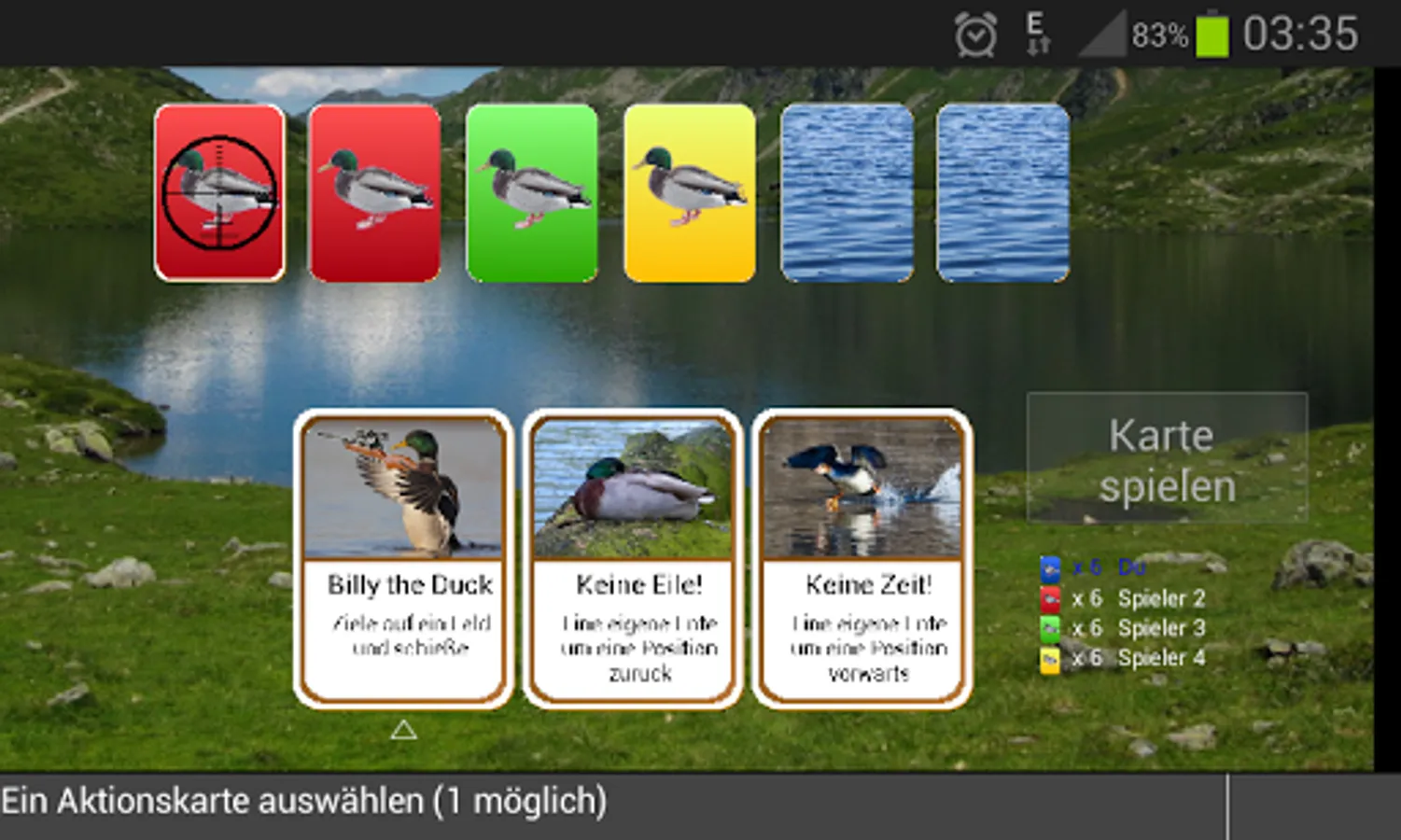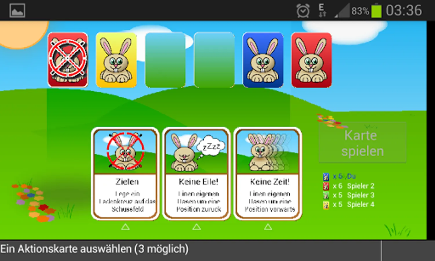 When it is your turn, you have to select an action card. Depending on the card, one or more cards on the field of fire have to be selected (this step is possibly not necessary). The action is finished by pressing the play button.