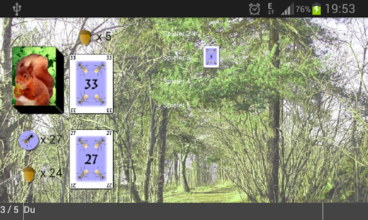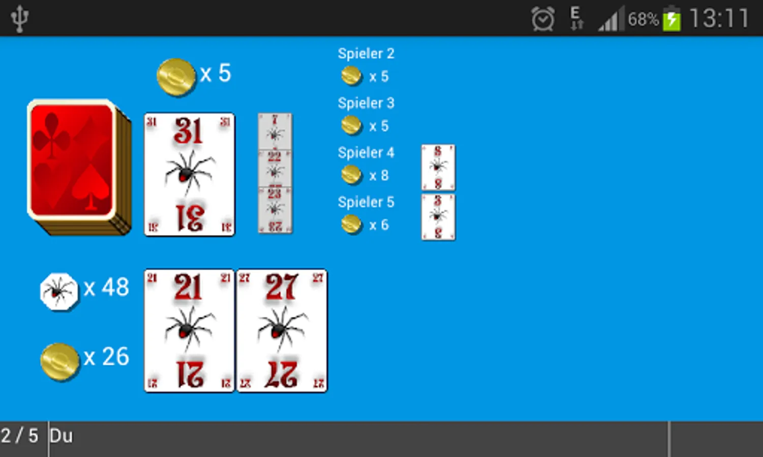 All players get 11 nuts at the beginning of a round. The cards that have continuous values from 3 to 35 are shuffled and 9 cards are taken away (they are removed from the game for the current round). The other 24 cards are in the middle where the card on the top is uncovered.