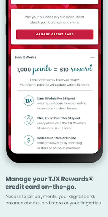 - Explore our enhanced TJX Rewards experience! Now it’s easier than ever to access your earned Rewards Certificates digitally, check your points balance, manage your TJX Rewards credit card account on-the-go, and redeem your rewards in-store.