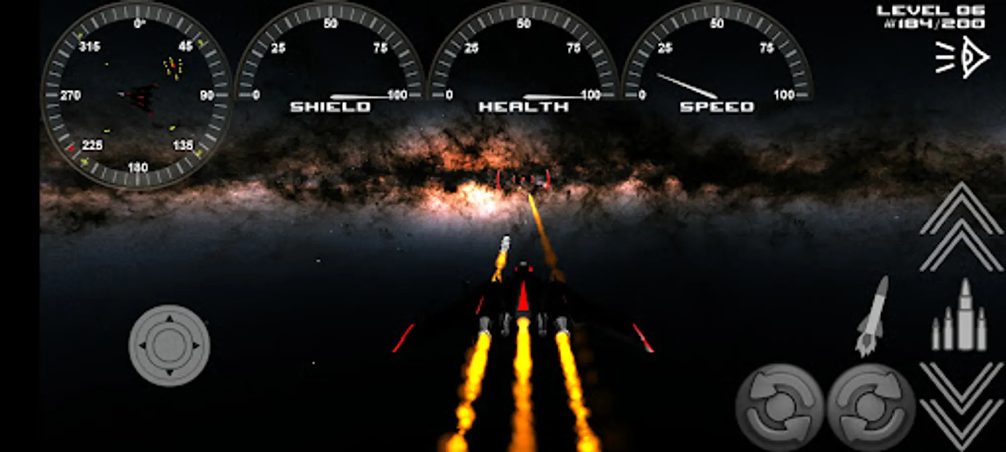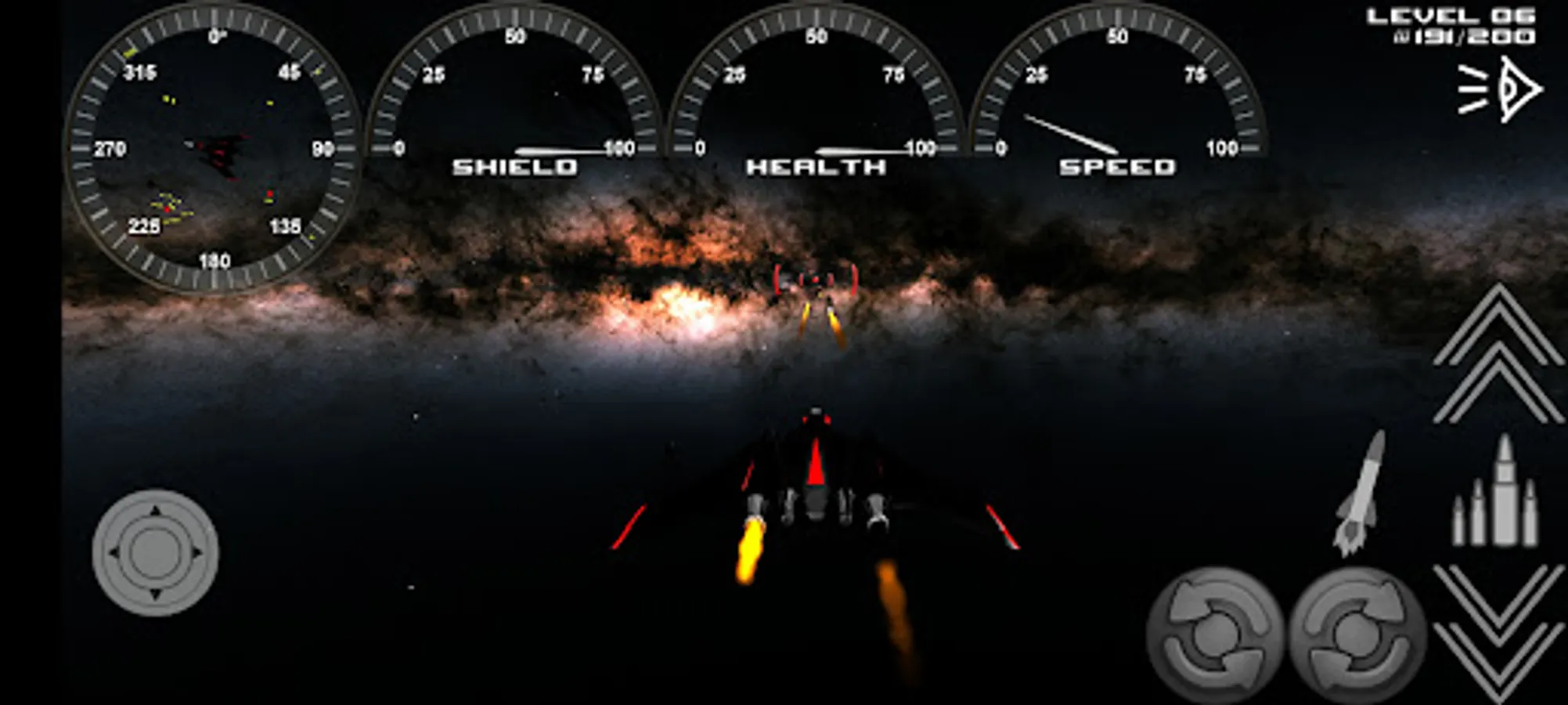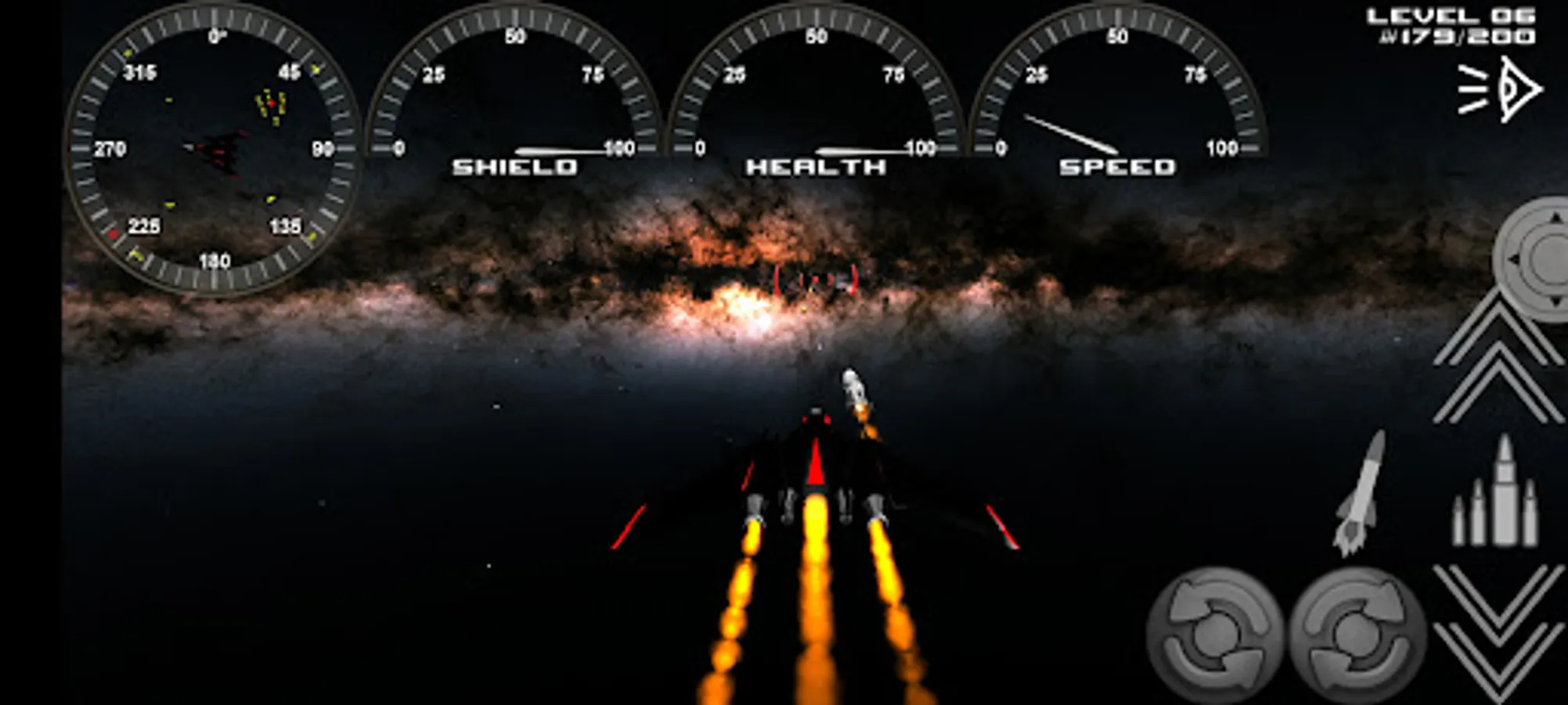 Touch and hold the control buttons to fire, roll, launch missiles, speed up, speed down.