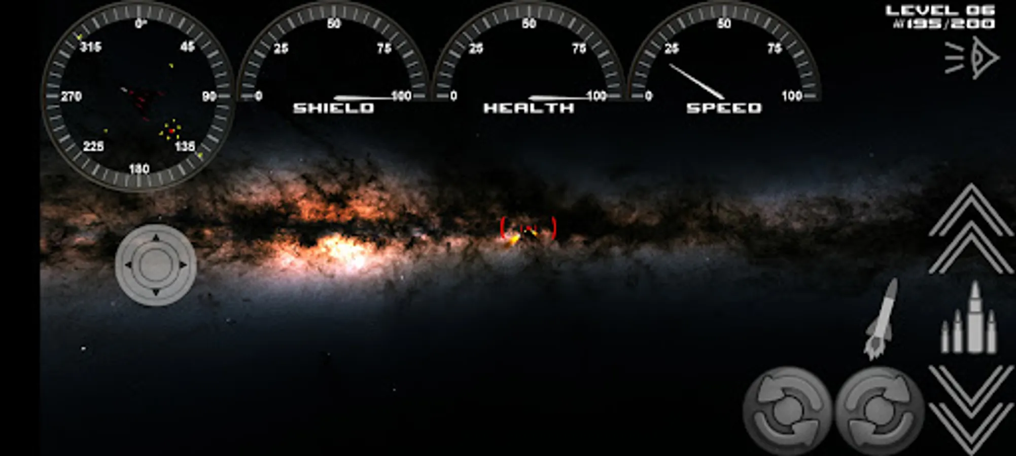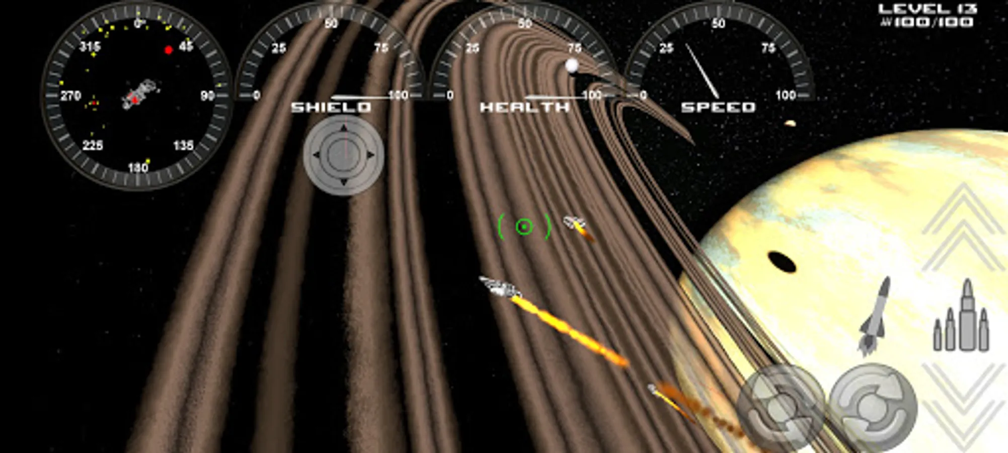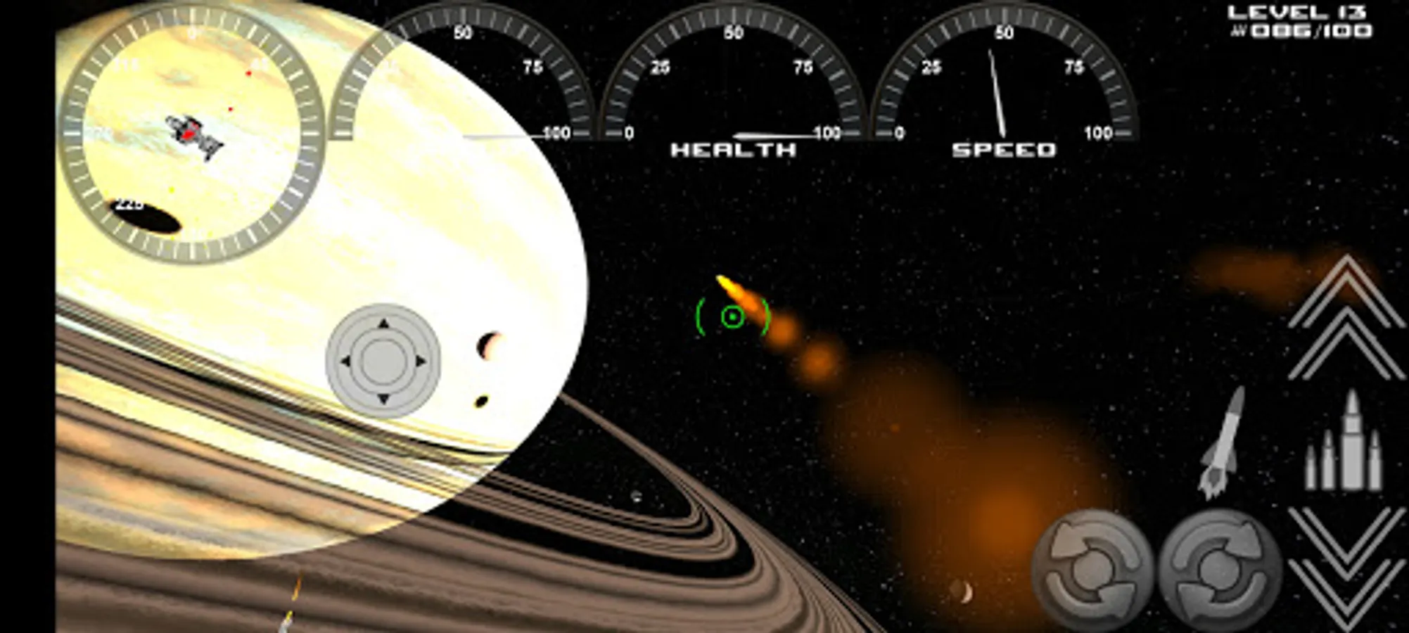 Touch and hold the control buttons to fire, roll, launch missiles, speed up, speed down.