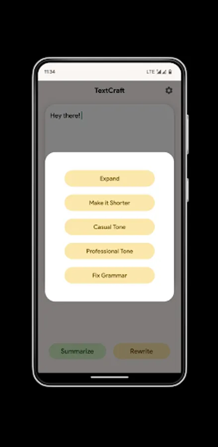 Rewrite: TextCraft can also help with writing English content for work or social media. Just give any rough text as input and it will give you a well-written output while preserving the meaning, tone, and essence of the original text. By long-pressing on Rewrite you can access additional options like setting the tone, fixing grammar, expanding and shortening any text.