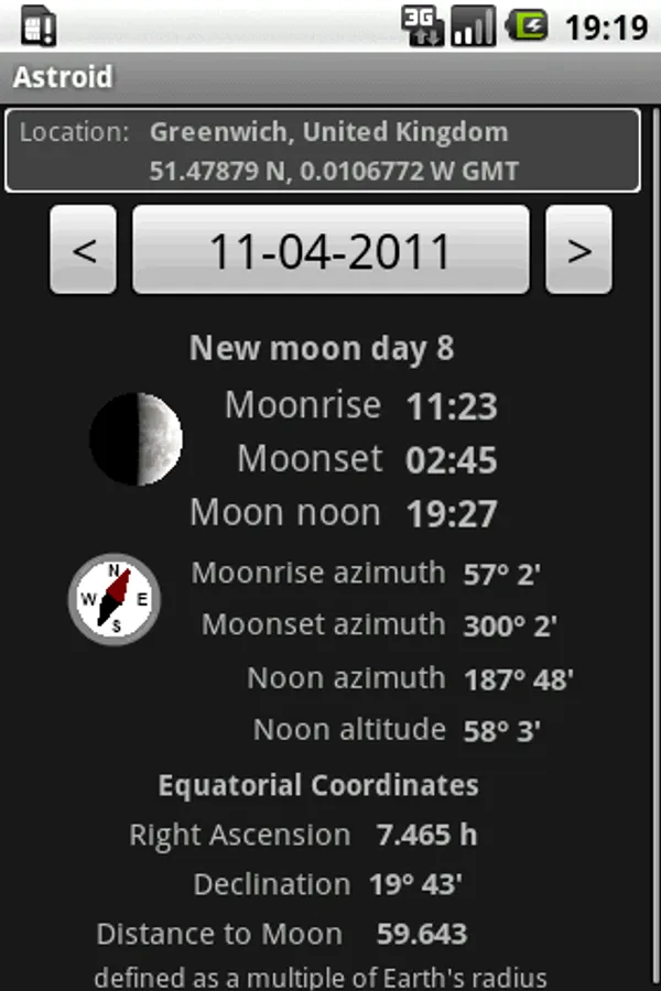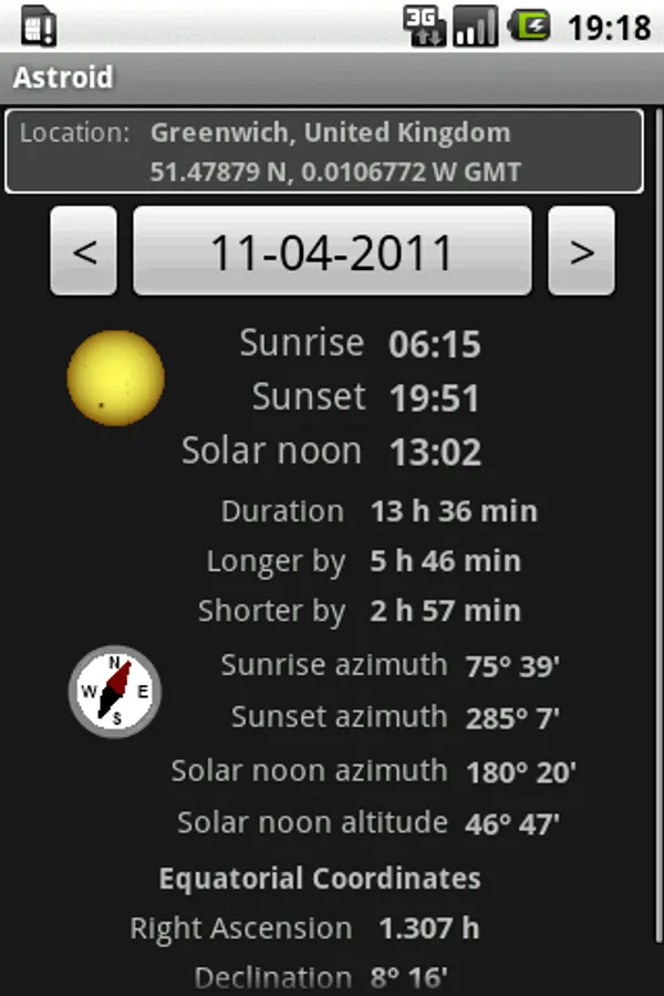 Application calculates precise moments of sunrise, sunset and solar noon. Additionally show day's duration, current difference between longest and shortest day. Daily card display current moon phase, day in phase period and moon's rise and set.