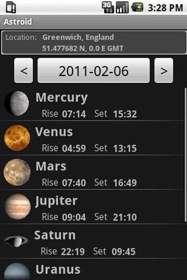Astroid calculates rise and set of all Planets - Mercury, Venus, Mars, Jupiter, Saturn, Uranus, Neptune and Pluto.