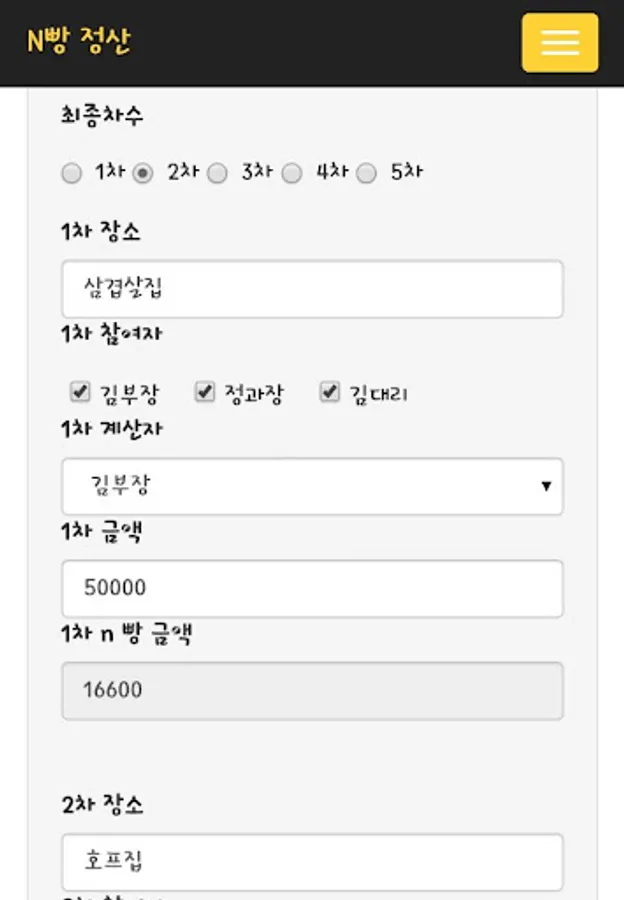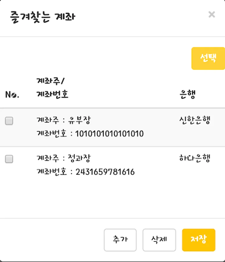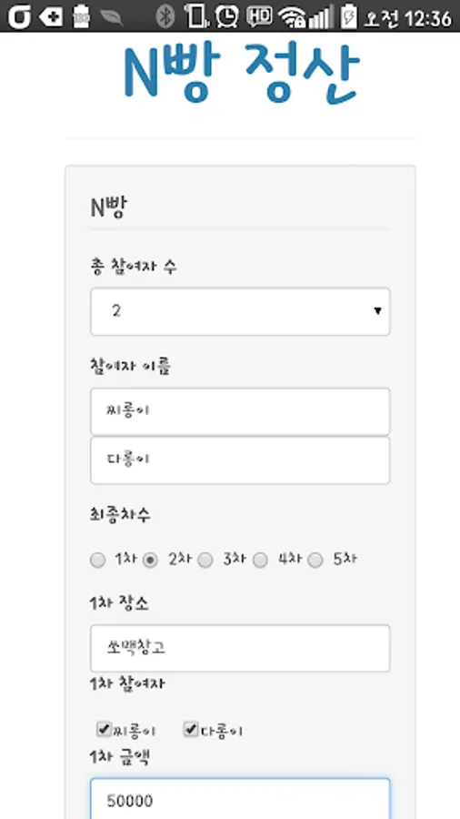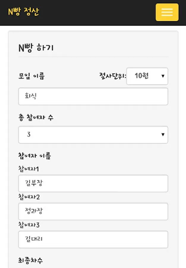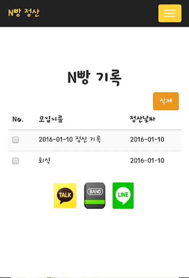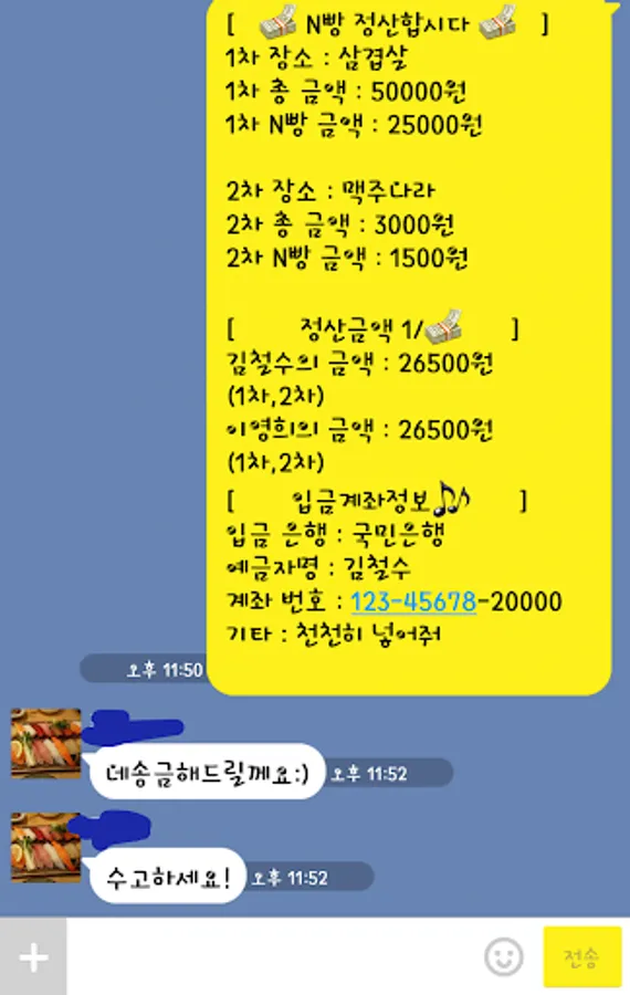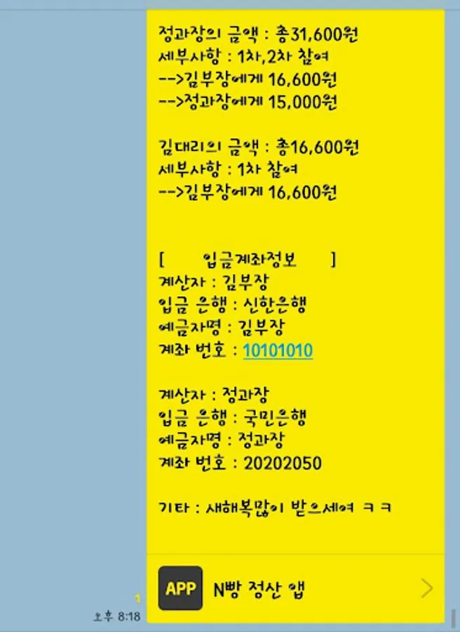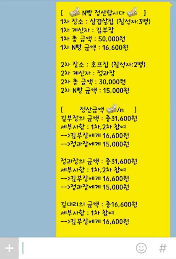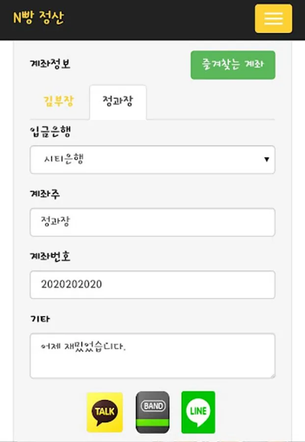 By calculating the settlement amount for the number of participants in each dinner has a feature that chasubyeol sent to Kakao Talk and Naver band line. Easy settlement through your enppang!