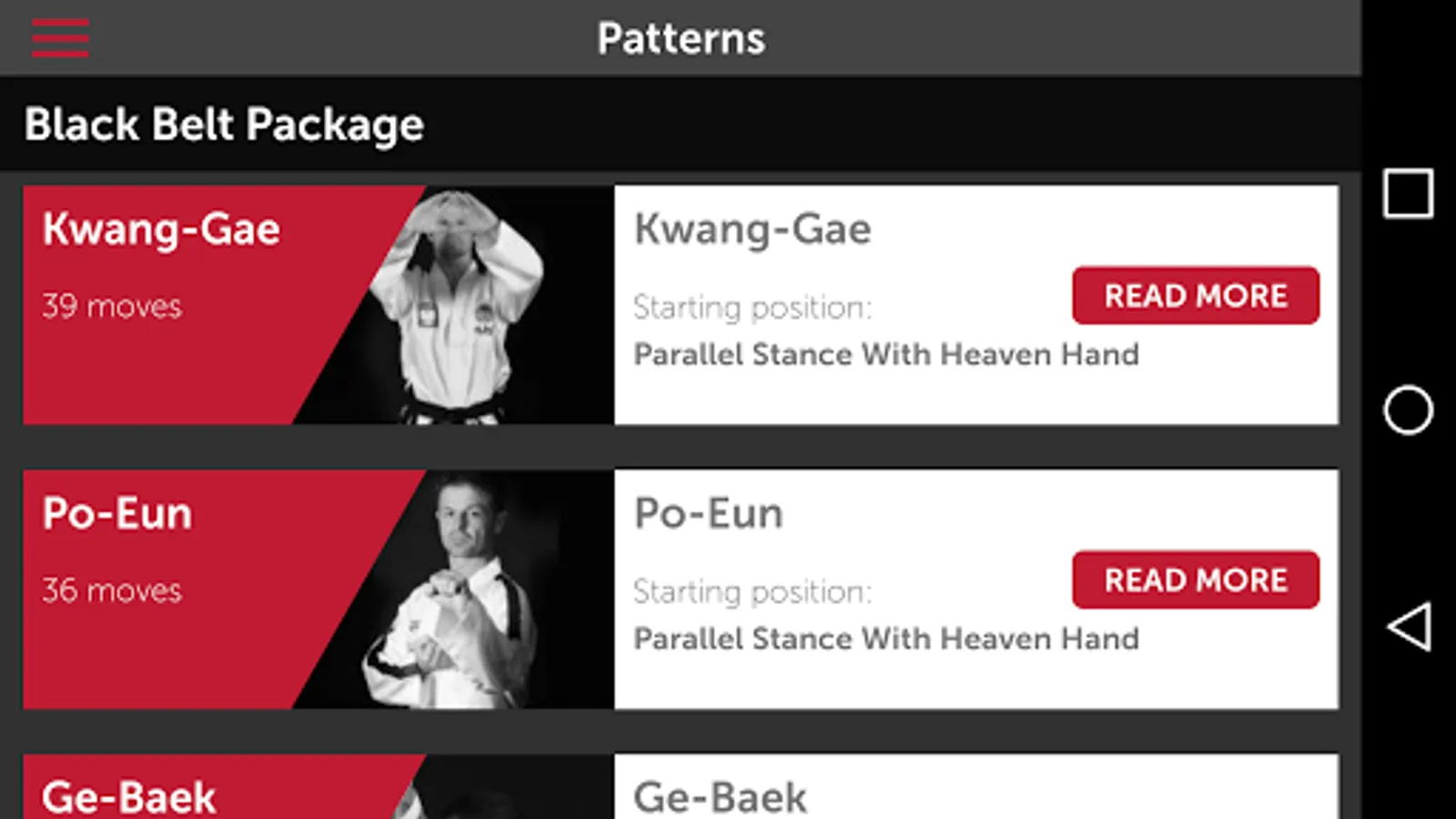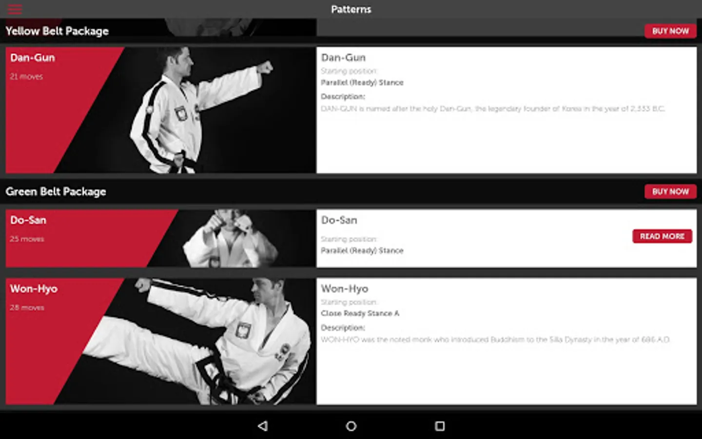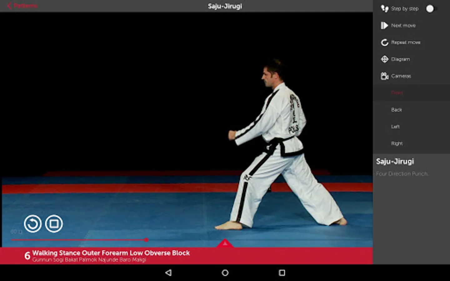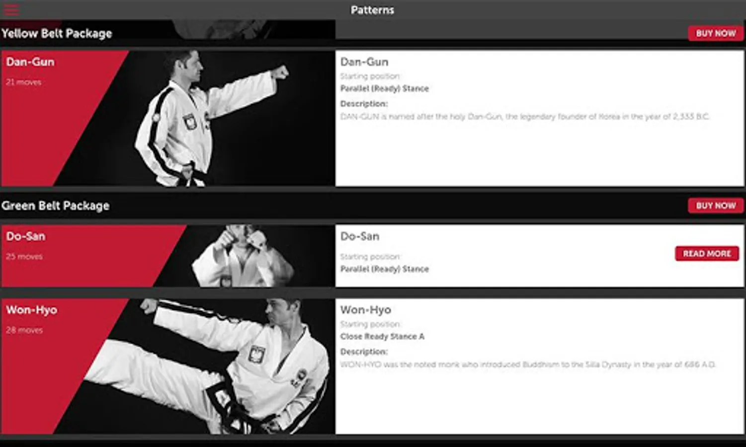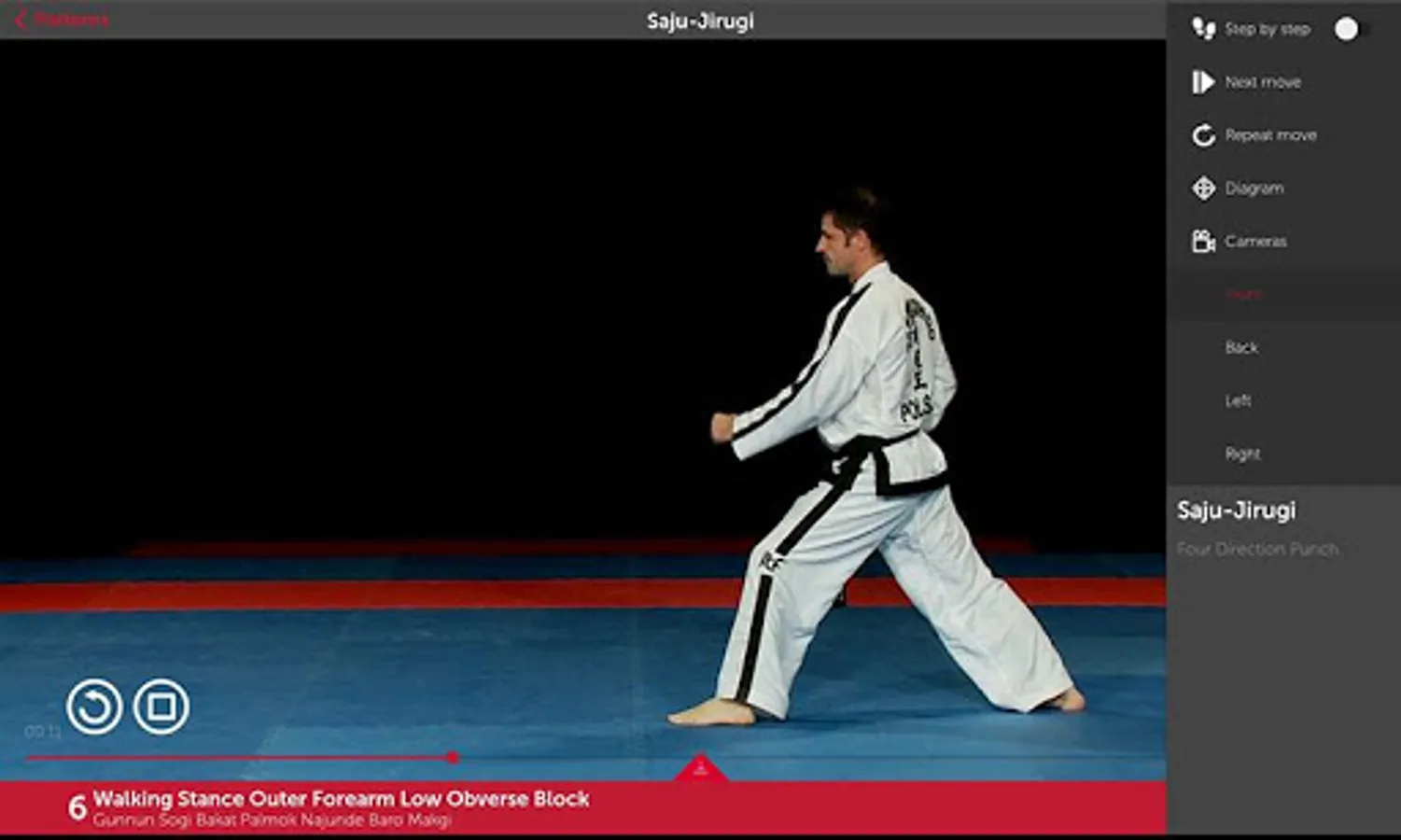 All 24 patterns plus Saju- Jirugi and Saju-Makgi. Every pattern can be viewed from four angles, with step by step and repeat movement option. Every movement is described in Korean and English. Diagram and description for every pattern. Easy to follow, easy to use in your home or dojang.