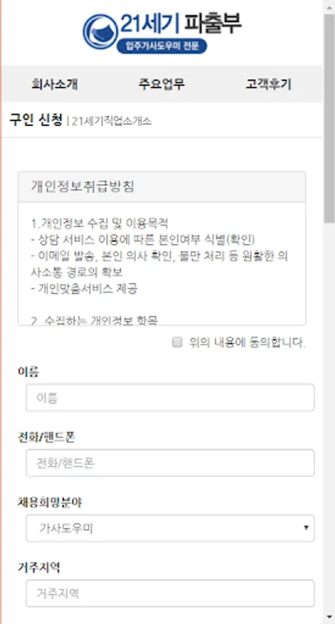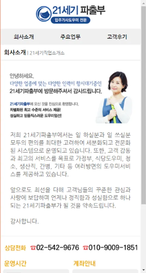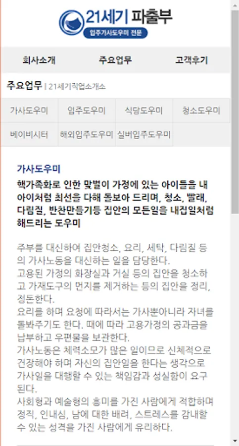 저희 21세기파출부에서는 일 하실분과 일 쓰실분 모두의 편의를 최대한 고려하여 세분화되고 전문화된 시스템으로 운영되고 있습니다. 또한, 고객 감동과 최고의 서비스를 목표로 가정부, 식당도우미, 청소, 생산직, 간병, 기타 등 여러방면의 도우미서비스를 제공하고 있습니다.
