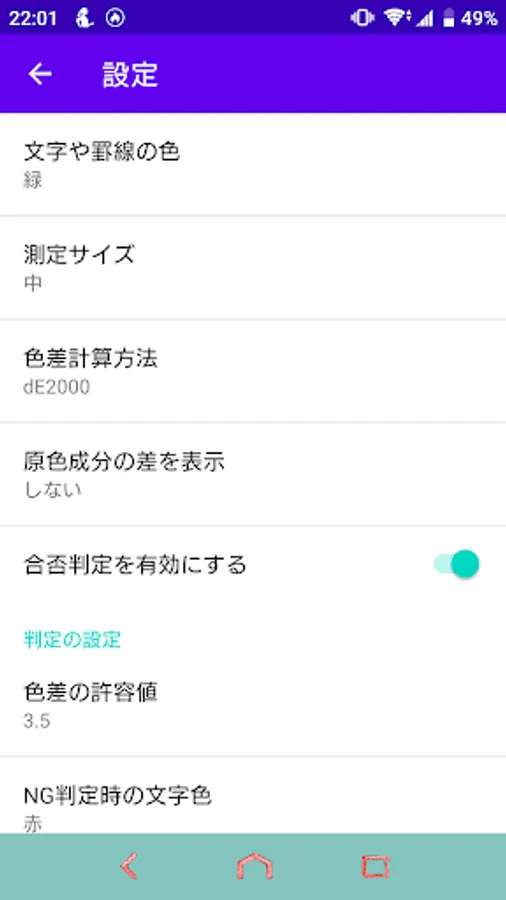 It is also possible to set a permissible value for the color difference and make a pass / fail judgment, or to display the difference in RGB and CMY components, which is convenient for color adjustment of design data.