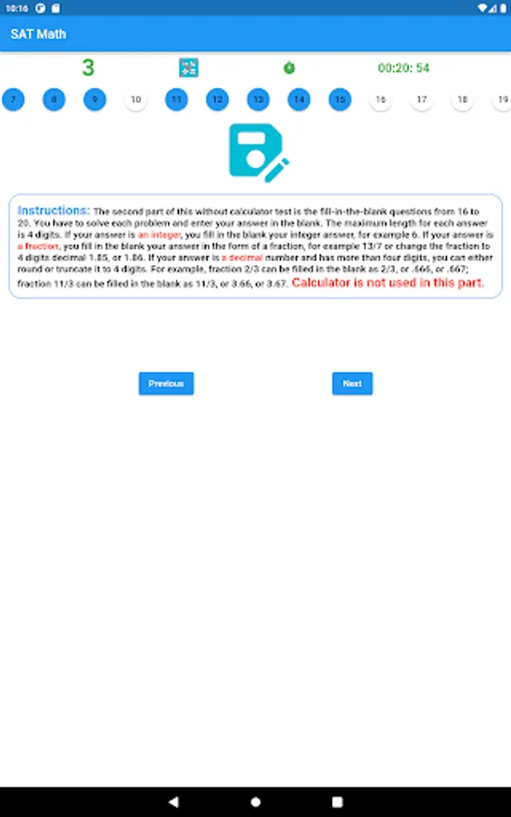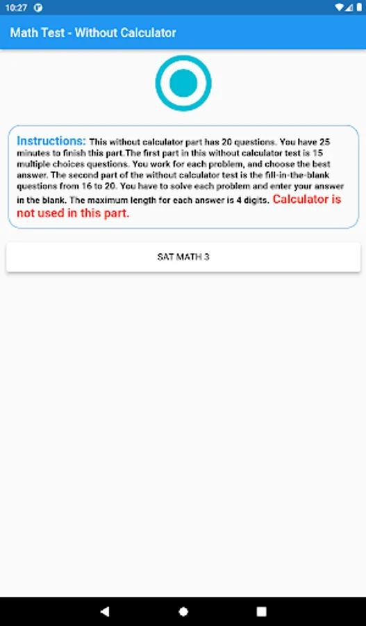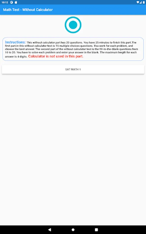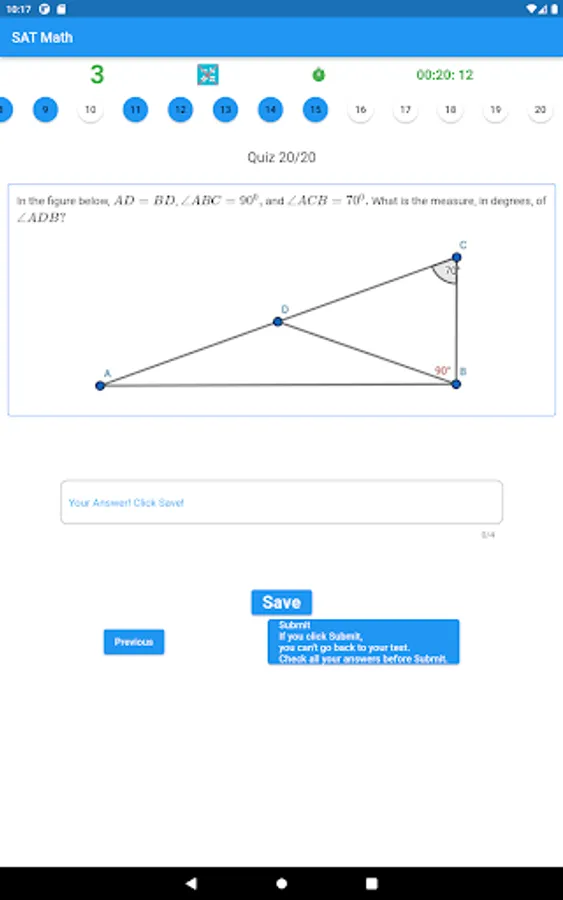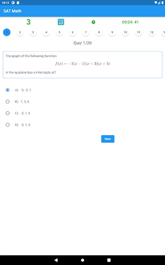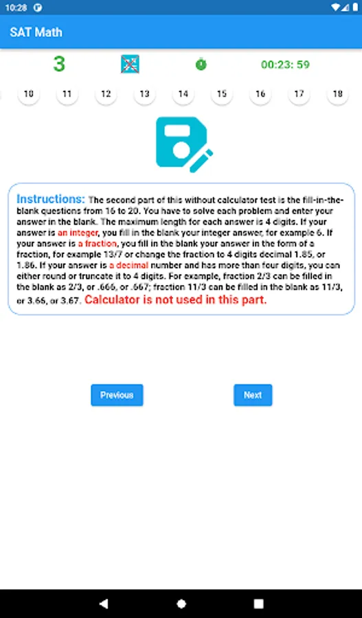SAT full-length, timed practice tests in Math. SAT App for Android-based smartphones and tablets explains studying for this challenging college entrance exam. Our App utilizes practically written questions to simulate the rigorous level of testing that the SAT exam provides. This SAT App for Android devices characterizes full-length Math tests (parts III and IV) and learning content for the SAT Exams. Try the timing full-length Math tests to assess your general score. Receive your result feedback to analyze your strengths in Math areas.