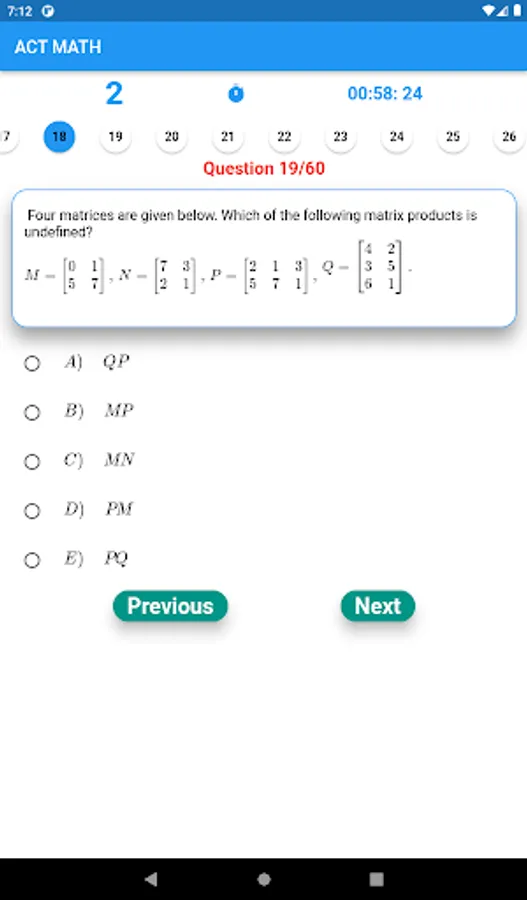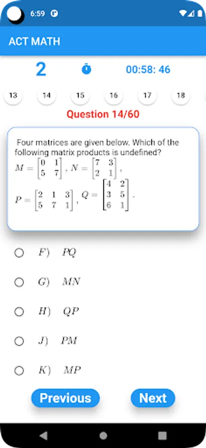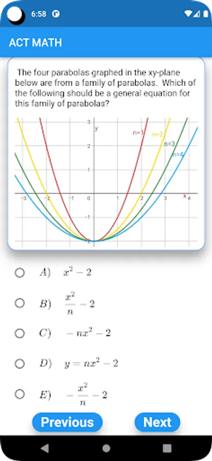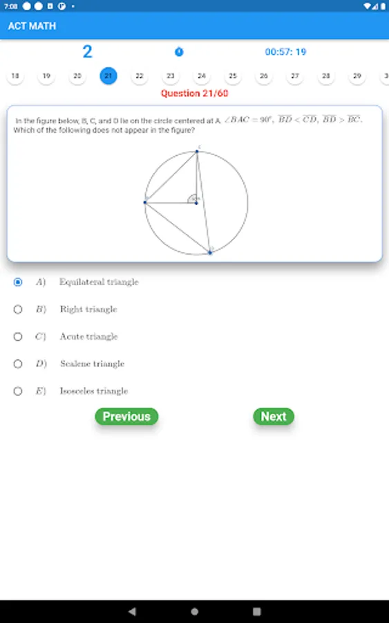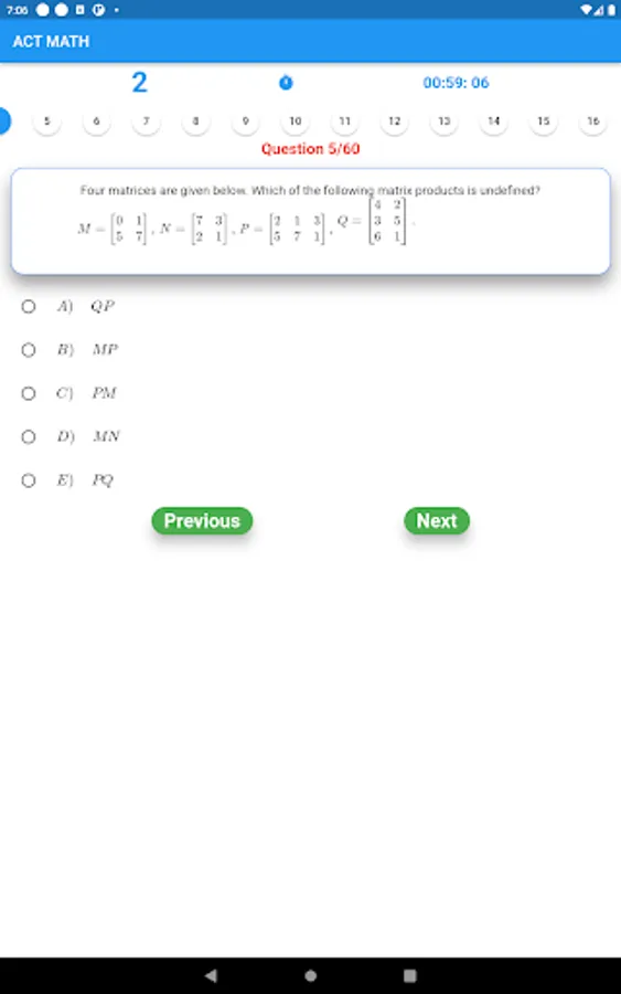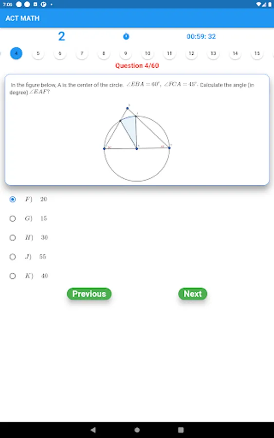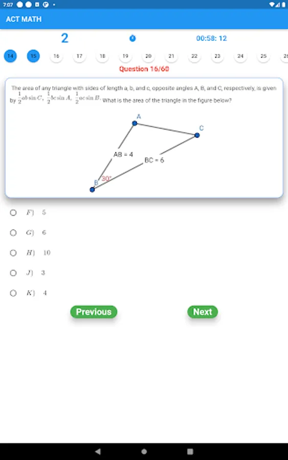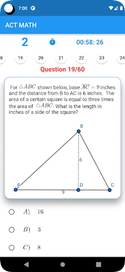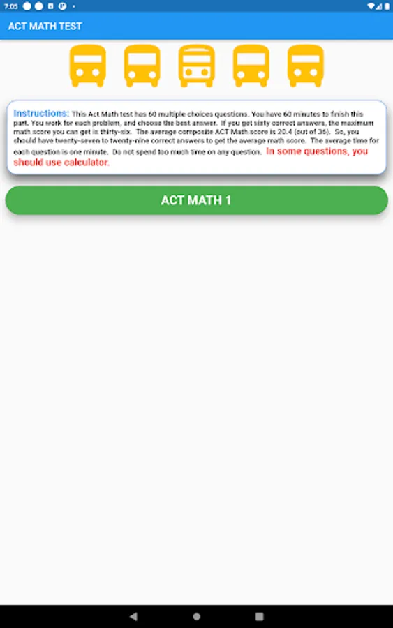 ACT full-length, timed practice tests in Math. ACT App for Android-based smartphones and tablets explains studying for this challenging college entrance exam. Our App utilizes practically written questions to simulate the rigorous testing level of the ACT exam. This ACT App for Android devices characterizes full-length Math tests (part II) and learning content for the ACT Exams. Try the timing full-length Math tests to assess your general score. Receive your result feedback to analyze your strengths in Math areas.