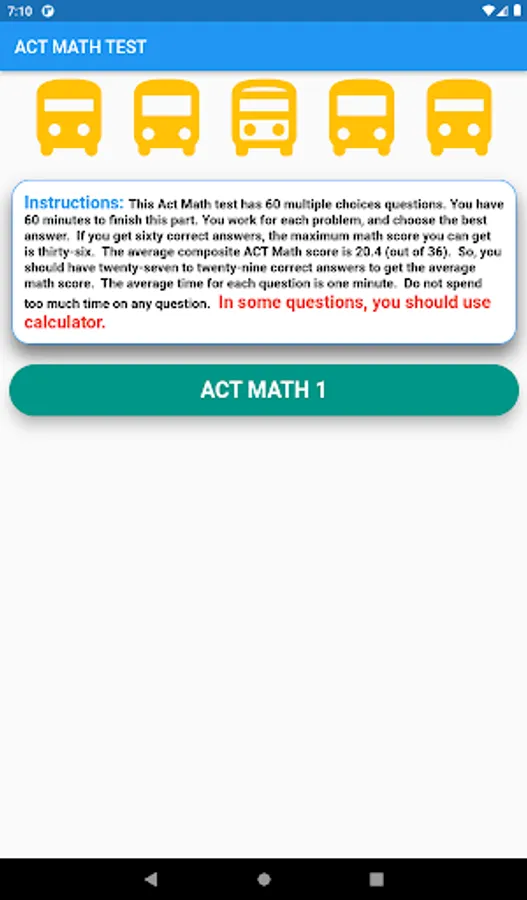 Students studying for this new Math ACT exam can find useful information, tricks, and tools in this App. This App is created to fit the Math ACT Part changes. Students can test their best for their future in college and also in their careers. Students should take their time to do each full-length practice test. Check the raw scores and the ACT conversion scores. They should spend more time practicing math problems. I believe these full-length math practice tests can help students accurately estimate their ACT MATH scores and decide how much time they should spend on the ACT MATH part. I hope that this ACT Math App for Android devices makes students feel more interested when they learn Math.