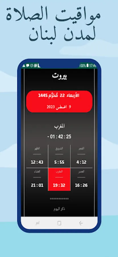 You'll find times for Lebanon times: dawn, sunrise, noon, Asr, Maghrib, dinner.