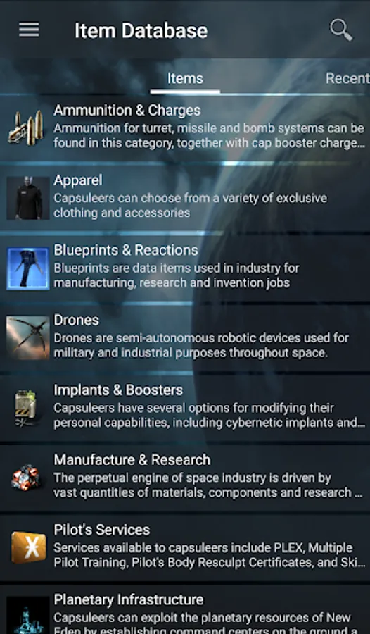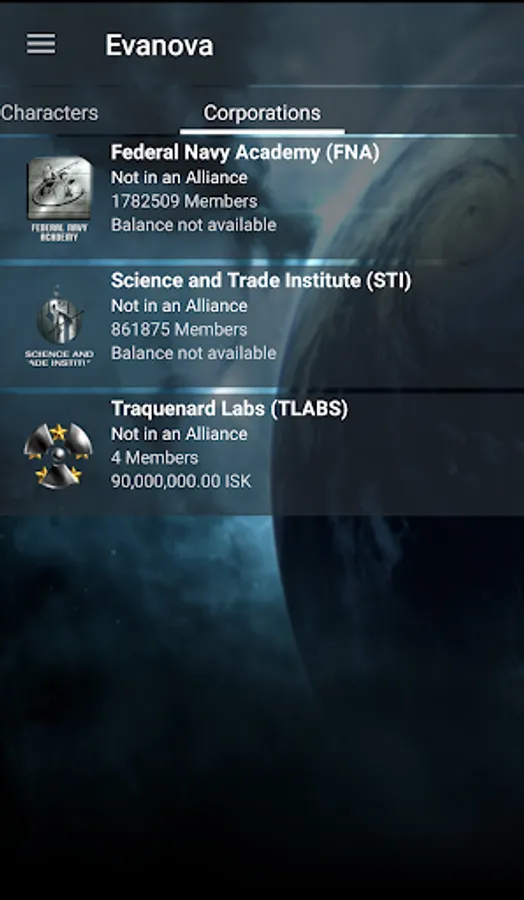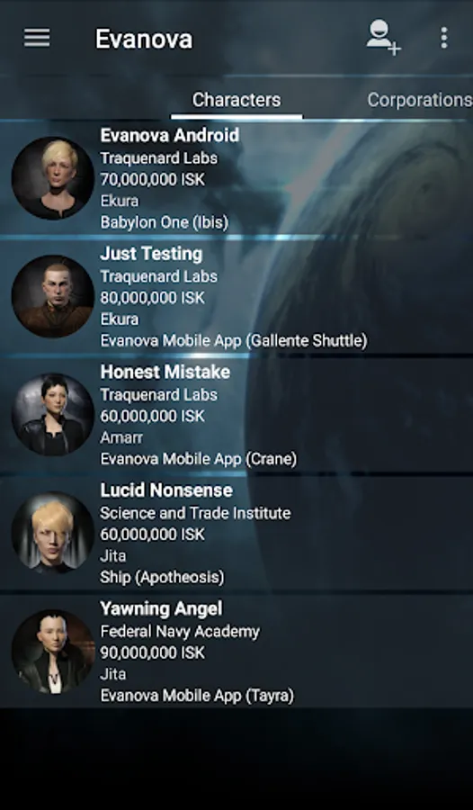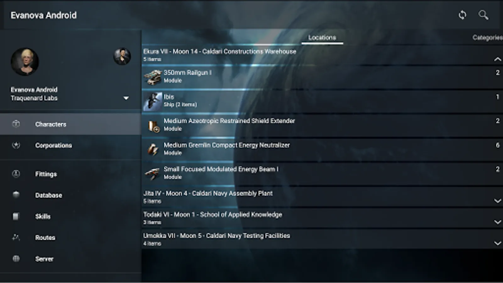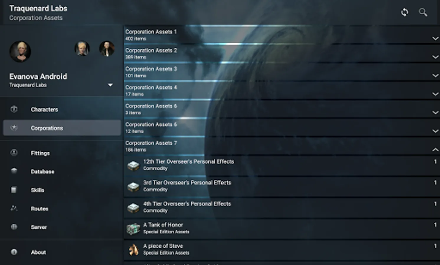 Evanova is the most complete Android application for managing your Eve Online characters, corporations, fittings or other Eve Online information.
