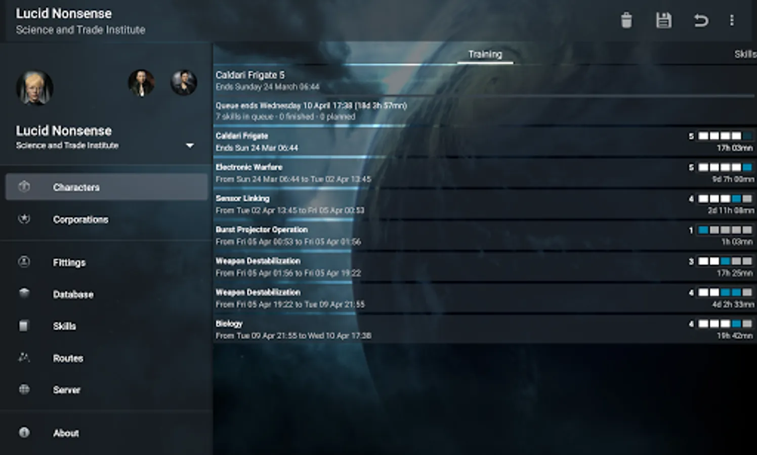 - Comprehensive information, including skill training, mails, contracts, industry jobs, colonies and much more.