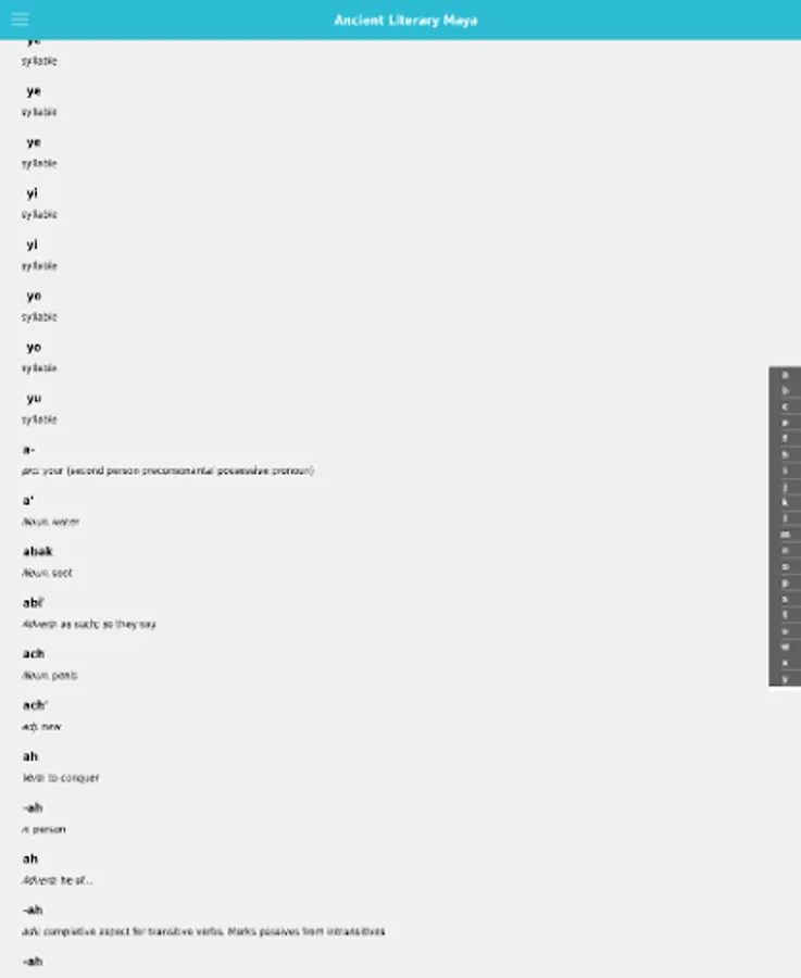 A collection of glyph symbols, and vocabulary words in ancient Mayan, also known as Ancient Literary Maya, Ancient Chorti, and Classic Mayan.
