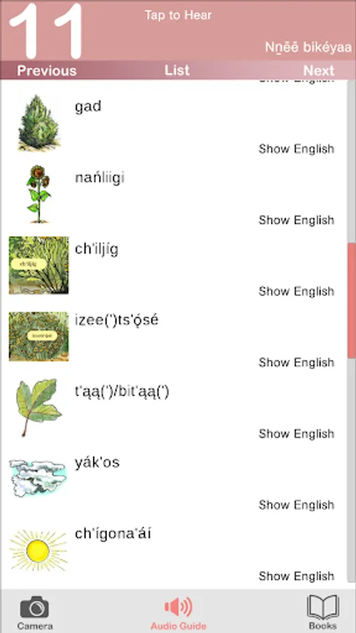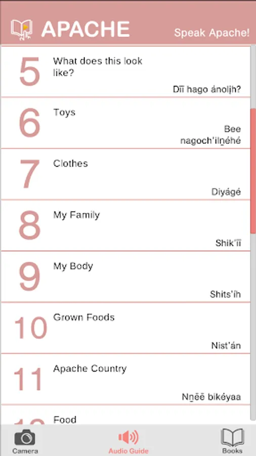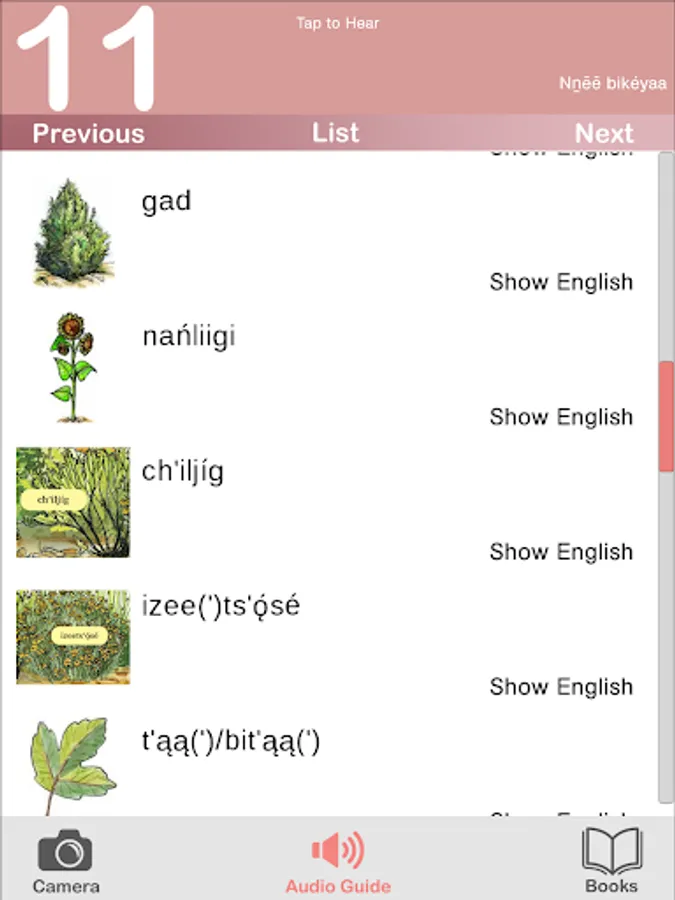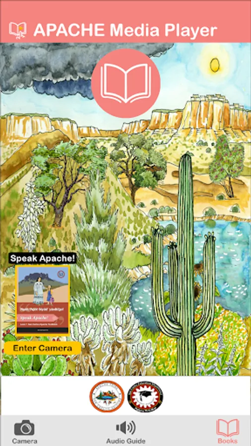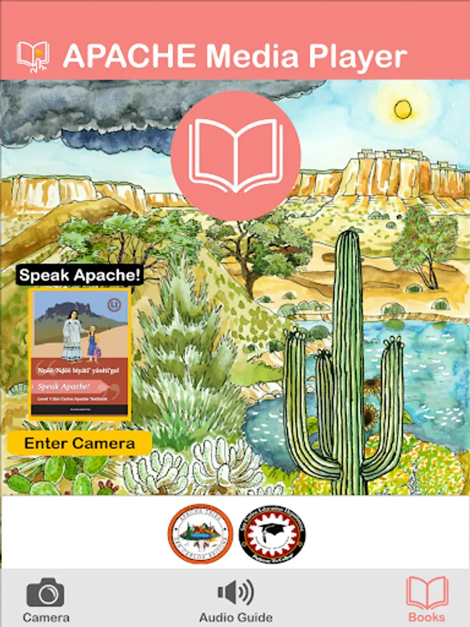 The San Carlos Apache Media Player is easy to use. You’ll start out in Books, where you can select and download the content for your books. The Camera mode lets you use your phone’s camera to put audio content right on the page. The Audio Guide mode has the spellings, images, English translations, and audio, all in one easy tap and swipe interface.