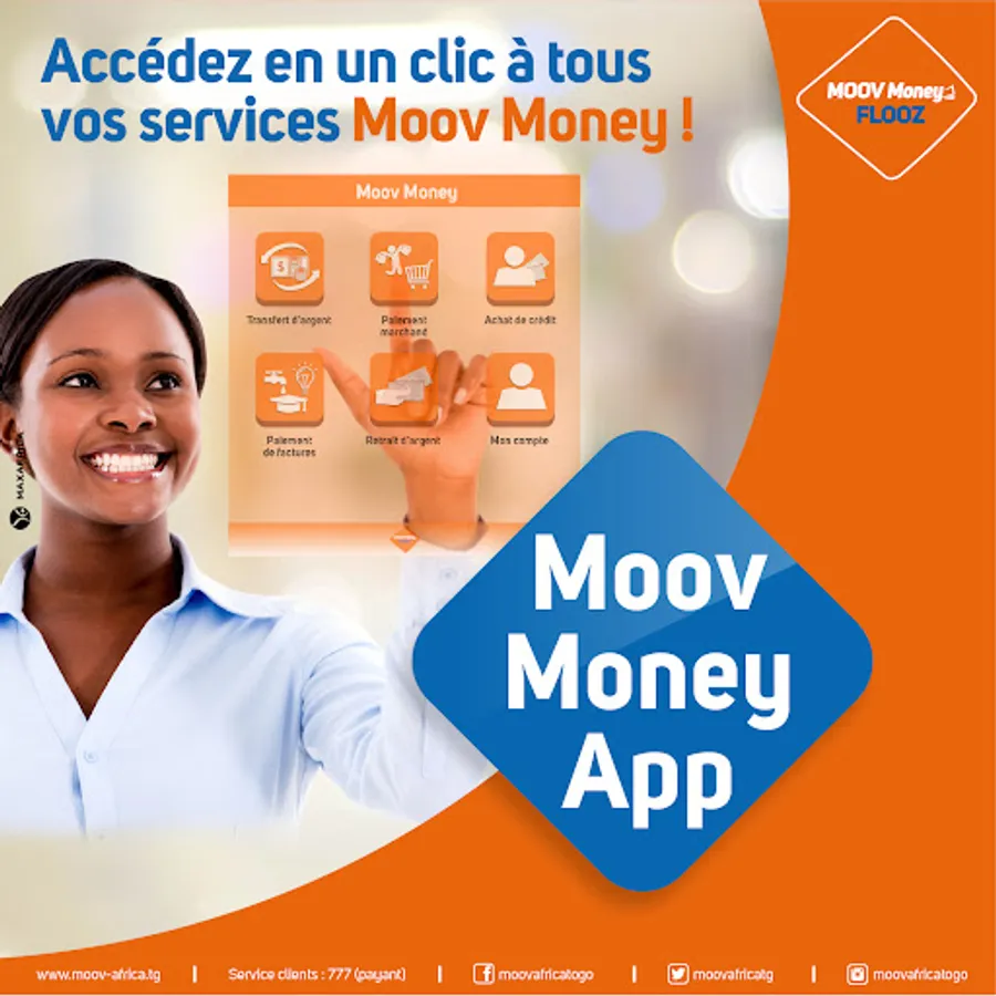 Access in one click to all your Moov Money Flooz (Mobile Money) services offered by Moov Togo: money transfer - money withdrawal - bill payment - purchase of communication credit - Moov Money Flooz account management
