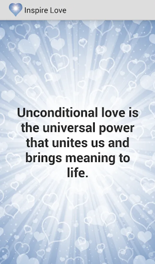 Inspire Love is a free app from our nonprofit The Love Foundation. Our vision is “inspiring people to love unconditionally.” This app is designed to bring you thoughtful and heart-felt inspirational quotes and resources that encourage your awareness of unconditional love. Use it anytime you want a spontaneous reminder of the love that you are.