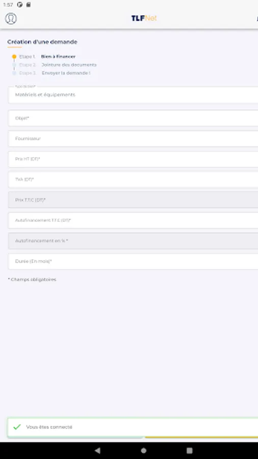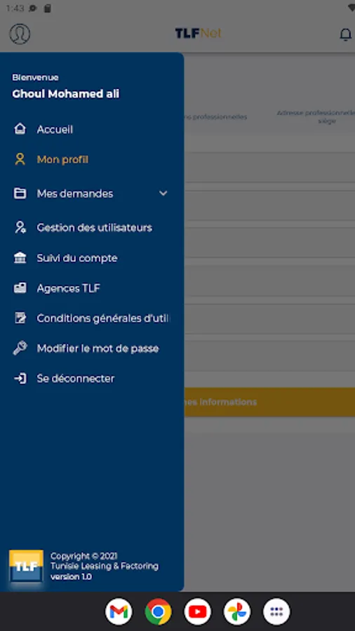 TLFnet is a Tunisia Leasing & Factoring (TLF) application for new and old customers to manage their requests remotely. The application also offers a set of information on the client's transactions with TLF which are necessary for the management and monitoring by its accounting and financial teams. This account brings together all of the client's transactions with TLF and allows them to monitor the progress of their files in real time.