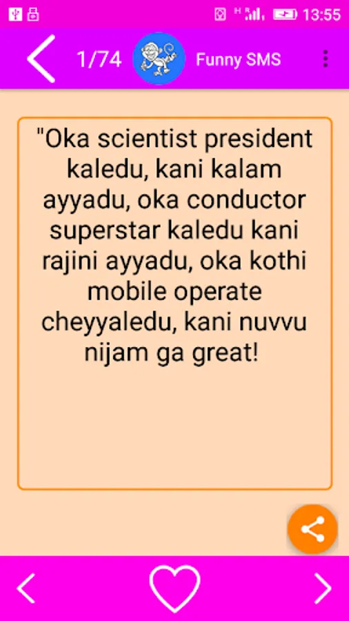 Telugu SMS App is the best andriod app dedicated for user generated sms text messages. We provide a simple & elegant way to save your favorite text messages and share them with rest of the world.