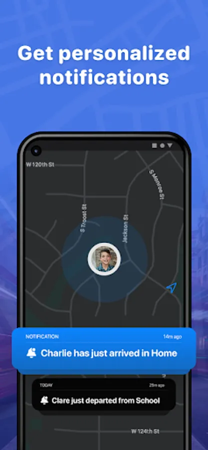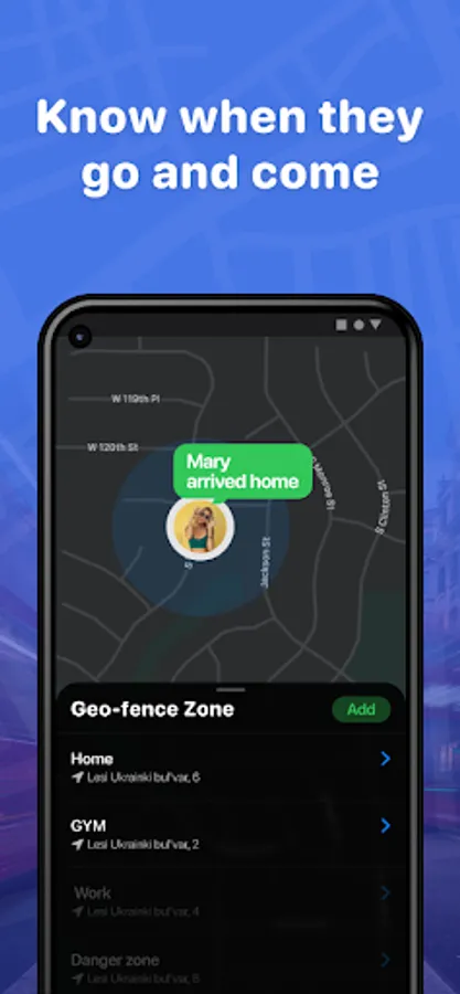 Geozones allows you to be alerted in real-time when your child arrive at their destinations. Simply drop a pin on your mobile map to set the center of the geo-fence at a specific position. Next, name your geolocation. Follow up by setting the radius for it. Once your zones are created, push notifications will alert you when your circle members enter and exit. Geozones automatically let you know where your kids are without any action needed from them. This secure tracker ensures that you always have a tracker app on hand.