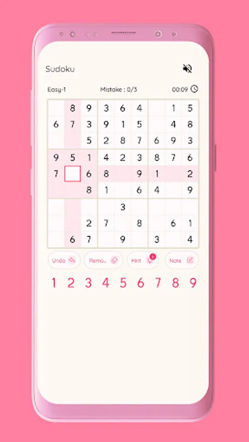 Place numbers 1 through 9 in empty cells. Each row, column and square(3x3) needs to be filled with numbers 1 through 9, without repeating any numbers within the row, column or square(3x3) When whole sudoku puzzle cells filled with solution without any errors, Sudoku Puzzle solved!!