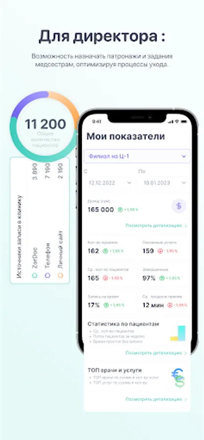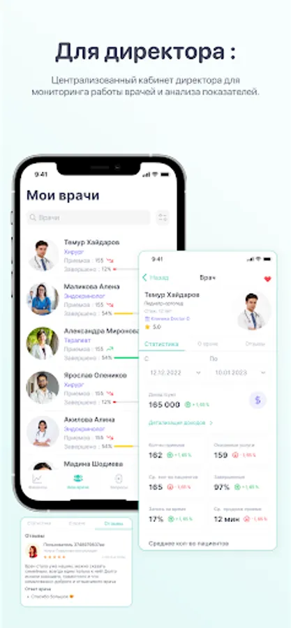 - Centralized director's office for monitoring the work of doctors and analyzing indicators.