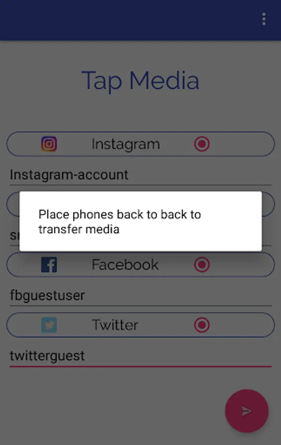 -Tap Media uses Android Beam and NFC technology to instantly transmit data! By tapping two phones back-to-back, Tap Media is able to send your social media information via an NFC tag to a receiver's phone. After the message is sent, the receiver may screenshot the result to store your social media data.