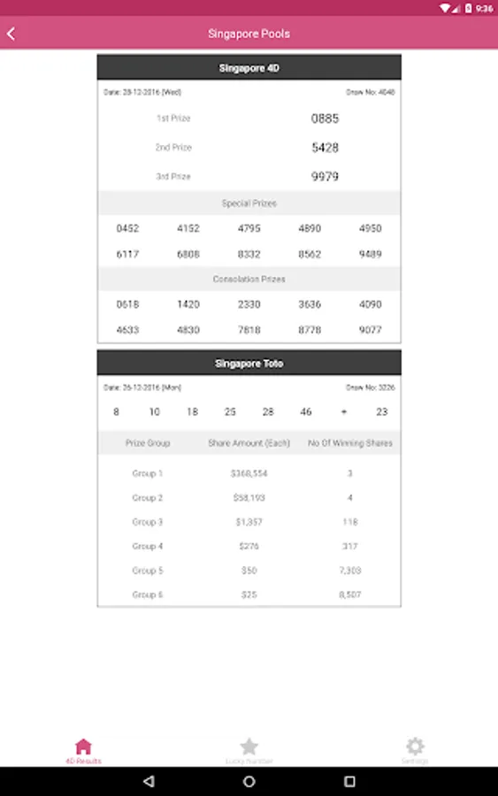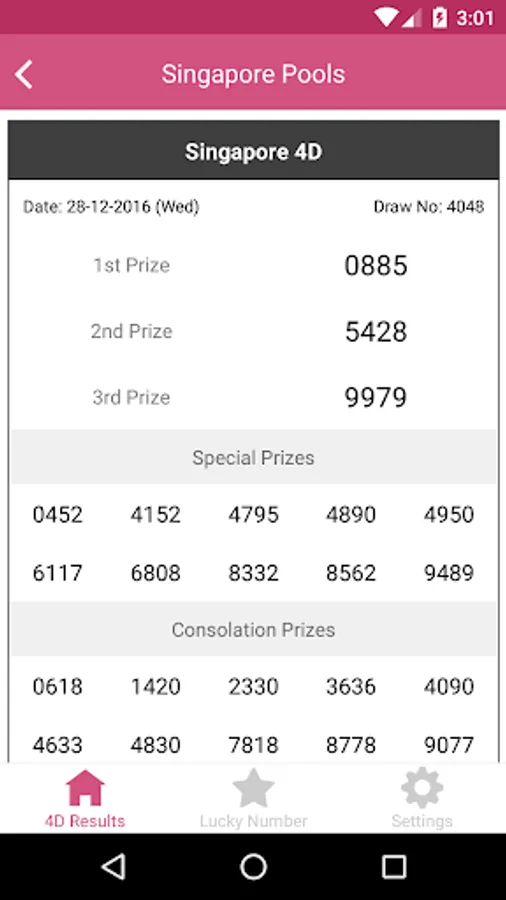 4D Results will deliver you the latest Malaysia and Singapore 4D, 5D, 6D lottery results for FREE everyday! This 4D app allow you to check the 4D results with fast and reliable speed!