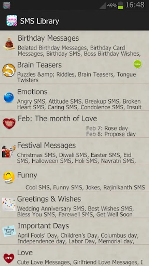 Celebrate festivals and share sms greetings like Christmas, Valentine, Diwali, Easter, Eid, Halloween and other holidays.