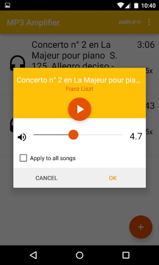 ☛ NOTE: since phone processors are weaker than desktop or laptop processors, amplifying a file sometimes can take significantly longer than on a real computer. This is the limitation of the hardware, as MP3 Amplifier already uses fully optimized MP3 processing implemented in native code.