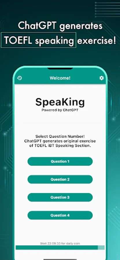 SpeaKing is the App that gives you the practical exercises of TOEFL iBT speaking section. Each time you tap the button, ChatGPT will generate the original question for you. It means that you can challenge the exercises as many as you want!