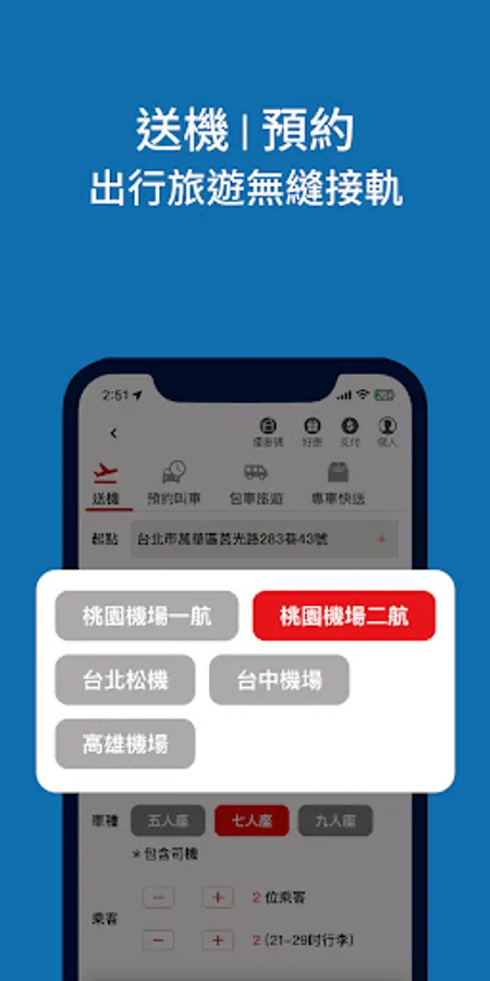Airport transfer: Taoyuan Airport, Songshan Airport, Taichung Airport, Xiaogang Airport can be reserved. You can see the status of the appointment after making an appointment.