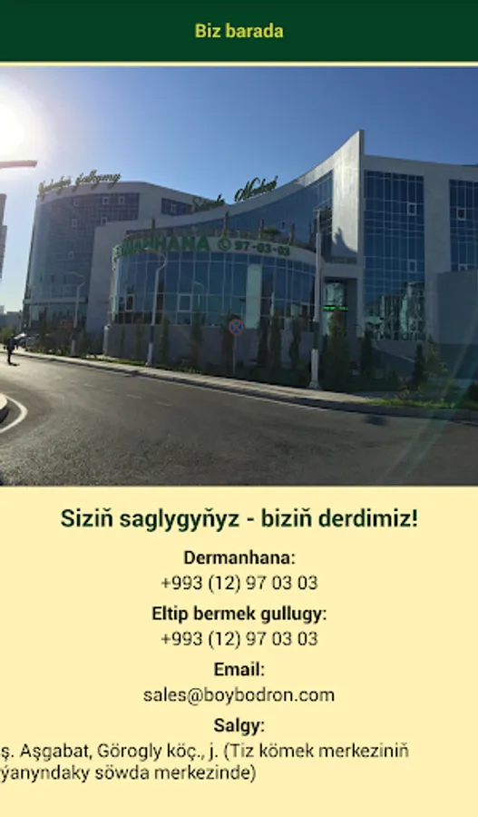 Dermanhananyñ salgysy: Aşgabat ş., Görogly köçesiniñ ugrundaky "Aşgabadyñ Ýalkymy" söwda merkeziniñ 1-nji gaty (Tiz kömek merkeziniñ gapdaly, Köşi ýaşaýyş toplum tarapy).