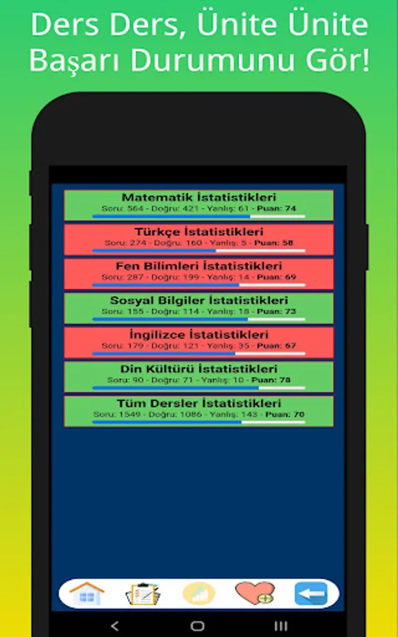 ✿ By clicking the My Statistics button on the main menu, you can see your success in the courses. In addition, when you click on the courses, you can see your unit-by-unit success. Courses and subjects with a score of 70 and above are shown with a green background, and those with a score of less than 70 are shown with a red background.